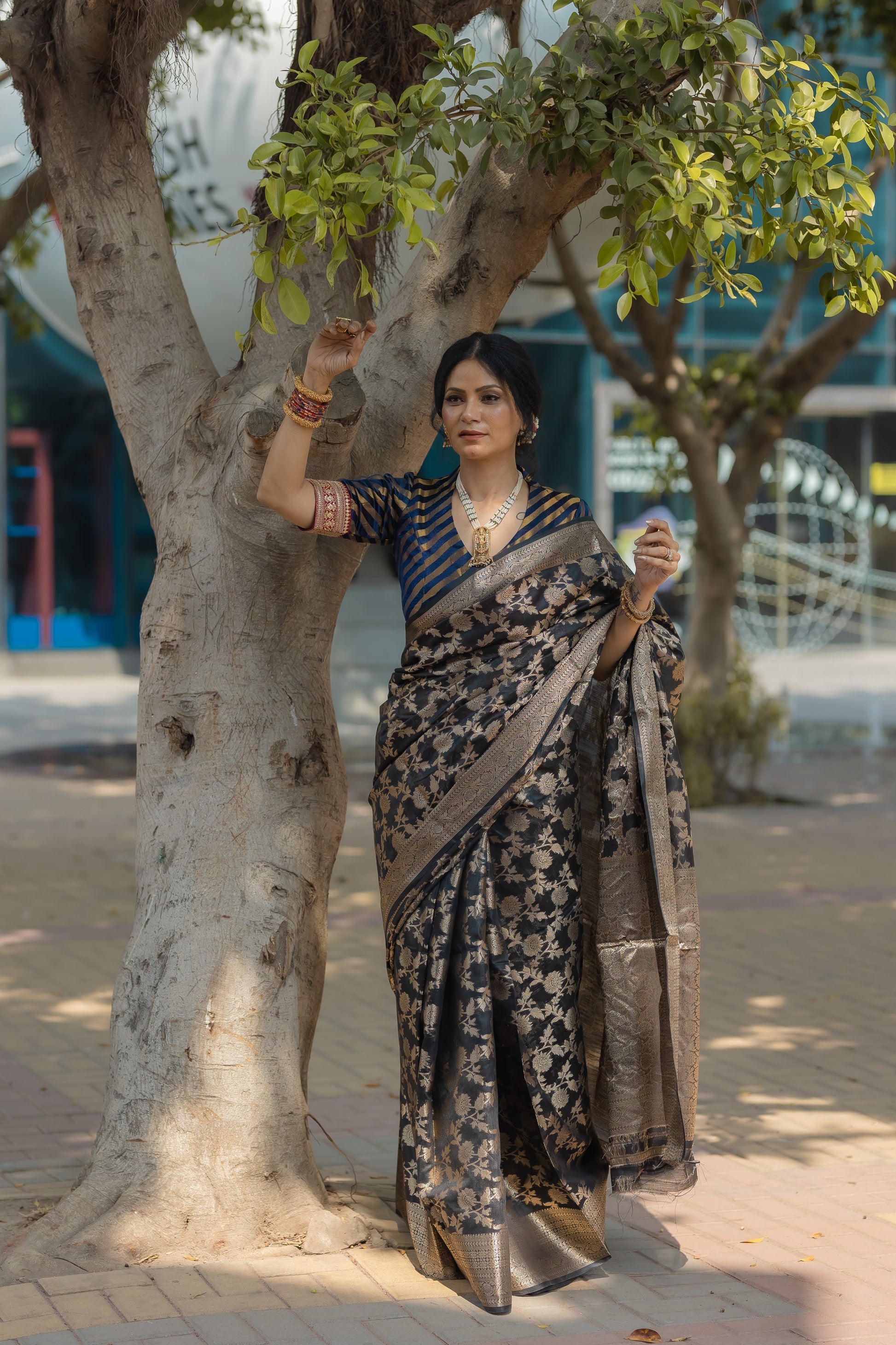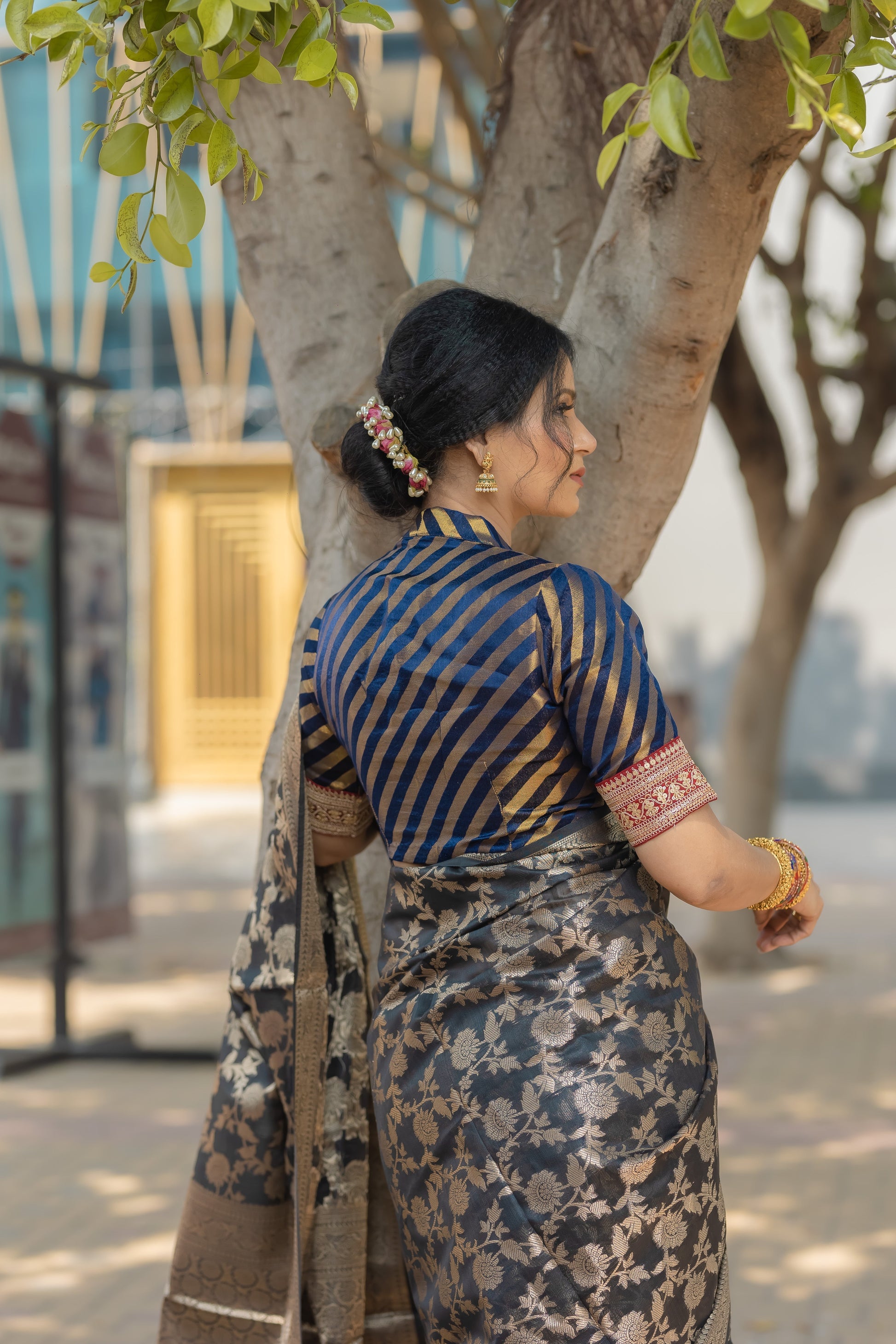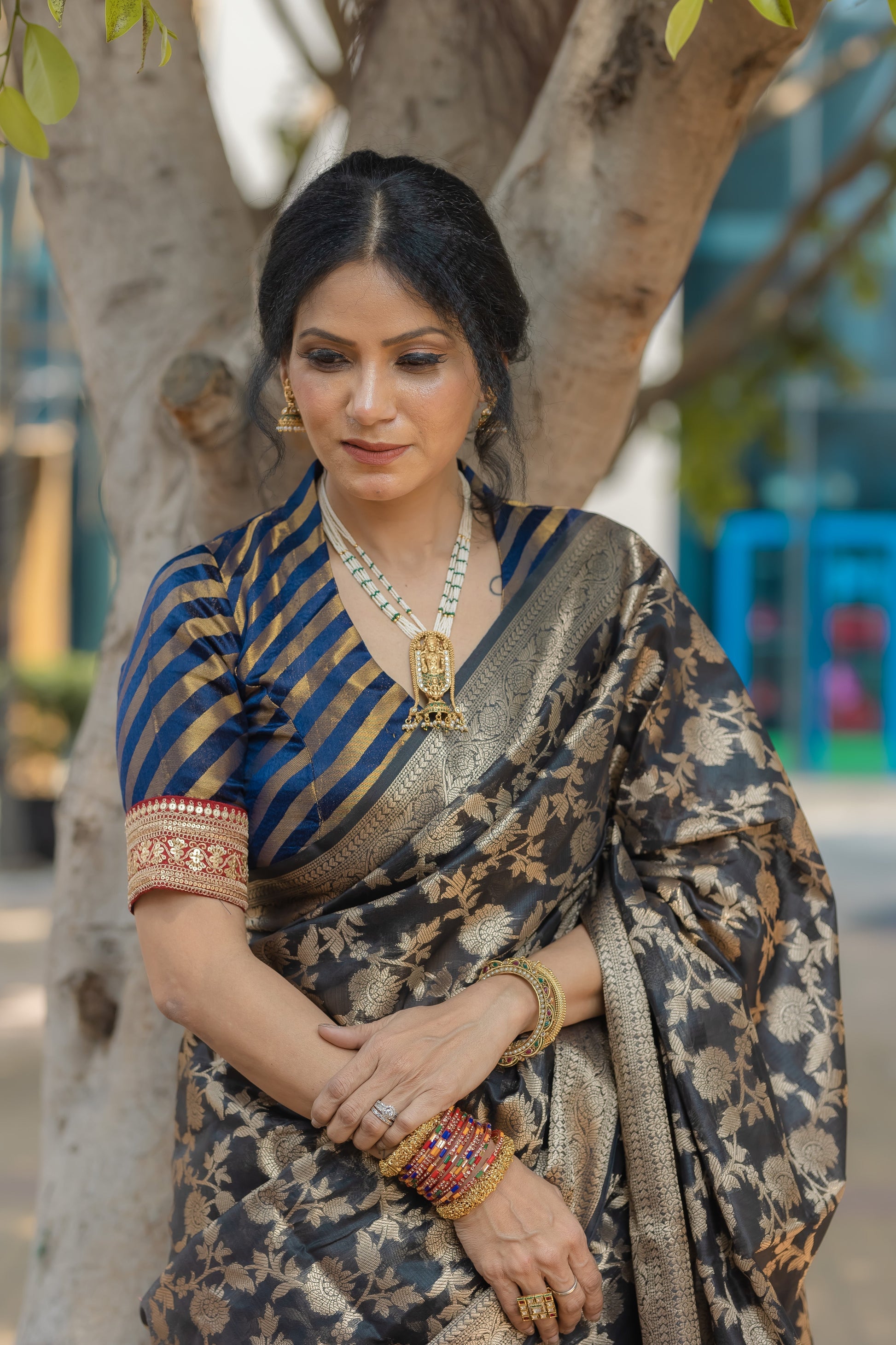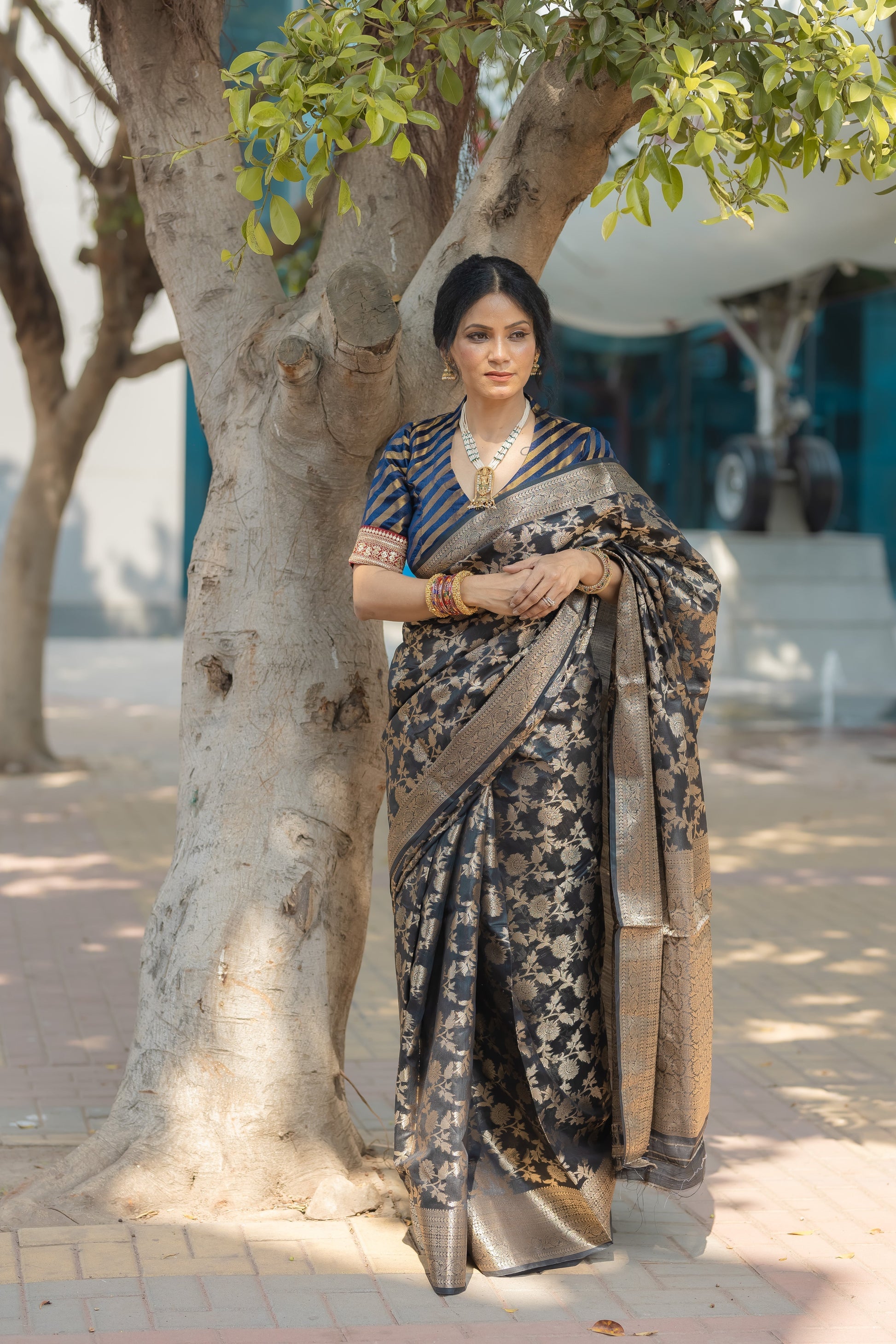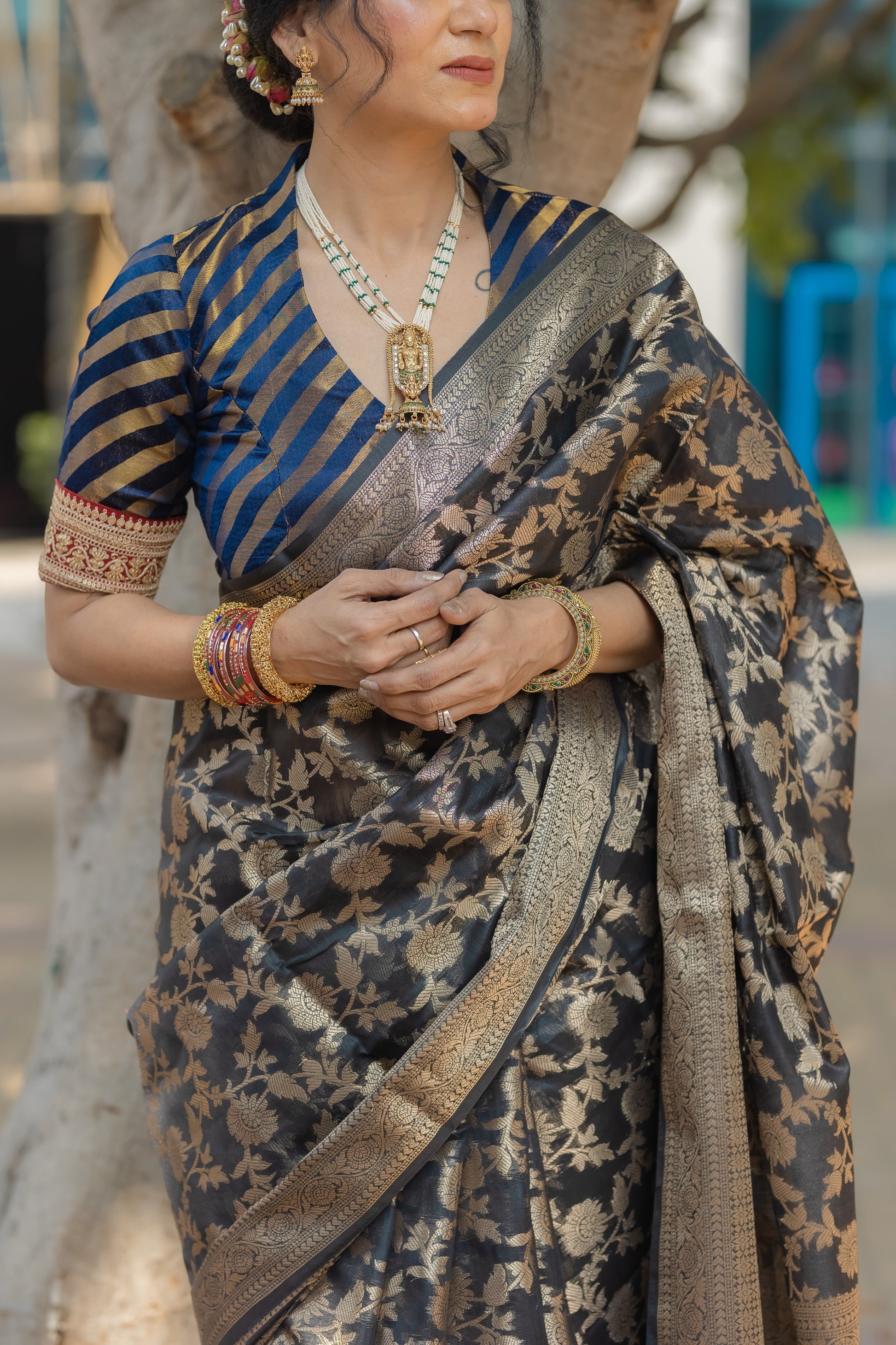 Saree is a symbol of elegance and dignity, it can be worn for different occasions. This saree is designed with gold jaal design zari weaving all over the saree with rich zari woven pallu and paired with brocade blouse.
