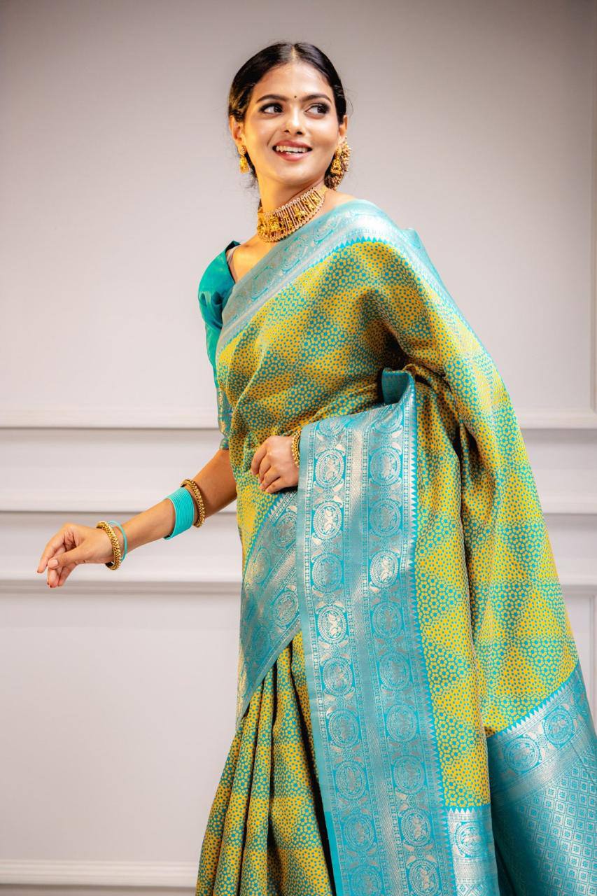 Aqua Gold Elegance Turquoise and GoldBanarasi Silk Saree WIth Fabulouse Blouse Piece