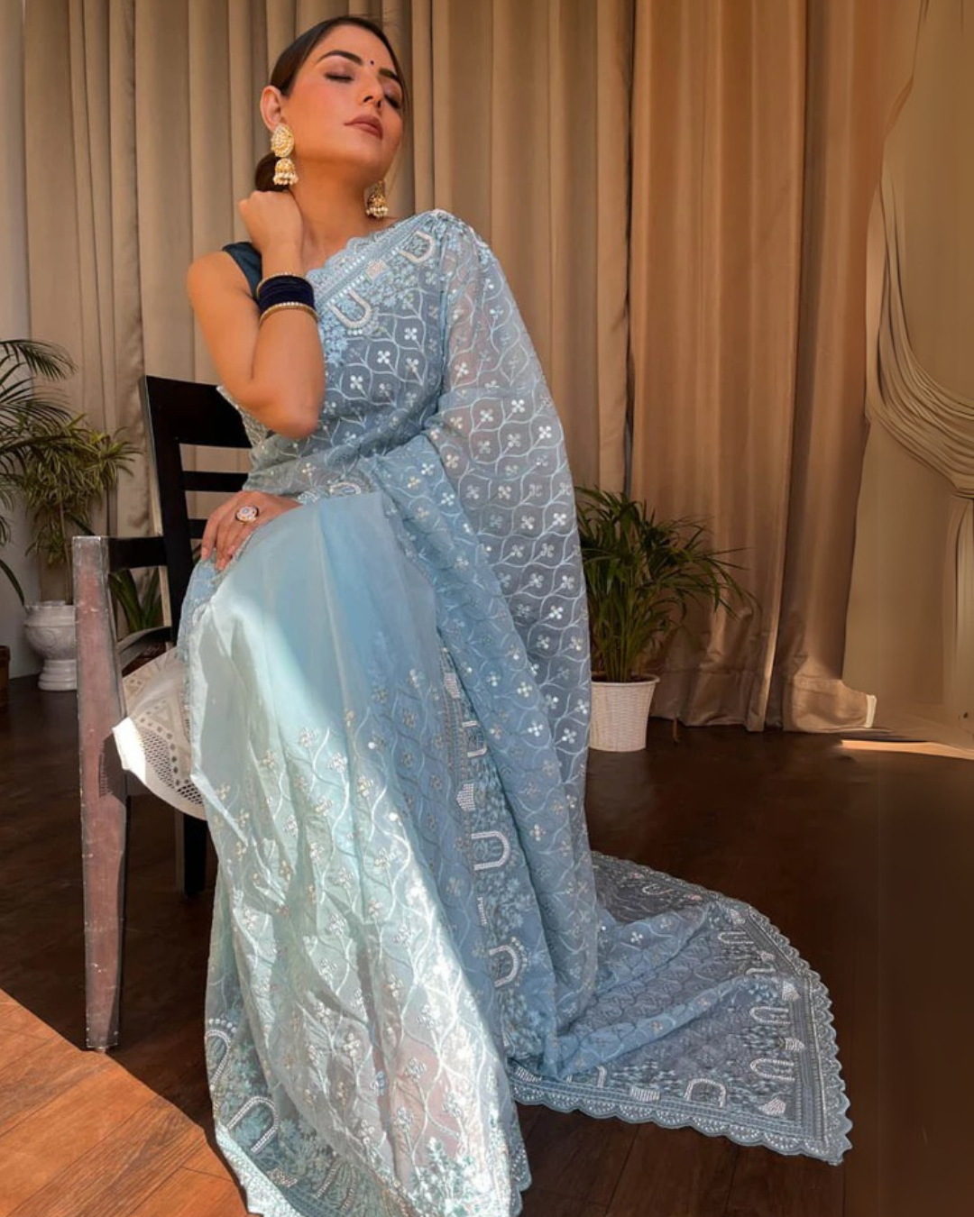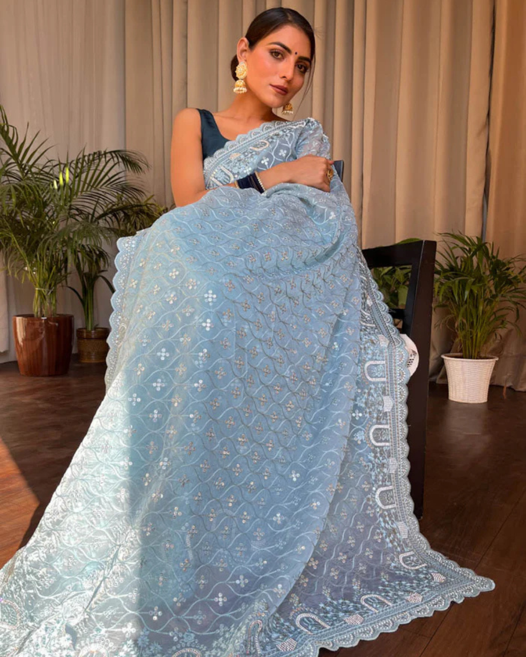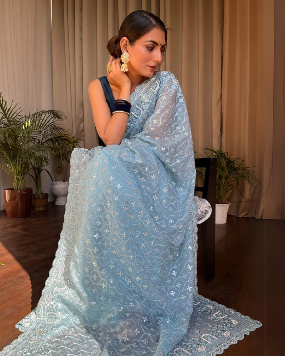 The "Azure Bloom" saree is a delicate blend of sophistication and charm. Made from premium organza silk, it features an enchanting sky-blue base adorned with intricate white floral embroidery and subtle sequin accents. The scalloped borders and detailed craftsmanship make this saree a standout choice for special occasions. Light and airy, this saree is perfect for making a graceful statement at day functions, weddings, or festive celebrations.