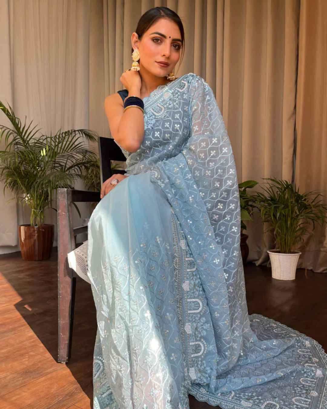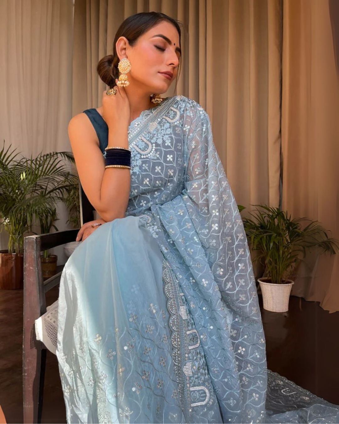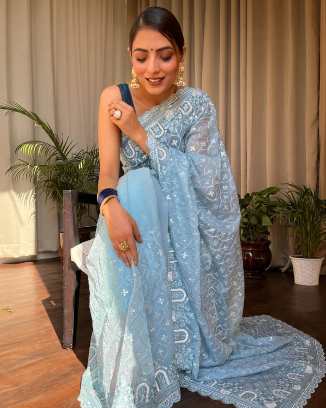 The "Azure Bloom" saree is a delicate blend of sophistication and charm. Made from premium organza silk, it features an enchanting sky-blue base adorned with intricate white floral embroidery and subtle sequin accents. The scalloped borders and detailed craftsmanship make this saree a standout choice for special occasions. Light and airy, this saree is perfect for making a graceful statement at day functions, weddings, or festive celebrations.