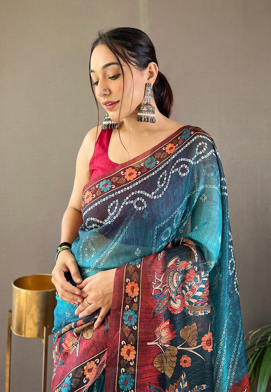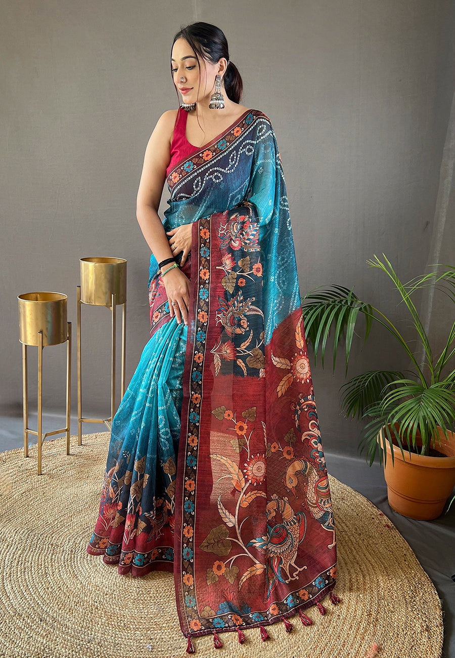 This elegant Bhargavi Cotton Kalamkari Printed Saree features all-over kalamkari prints, a vivid printed border, and a contrast kalamkari pallu with tassels. Crafted with breathable cotton fabric, this saree is ideal for traditional occasions and guarantees a timeless look.