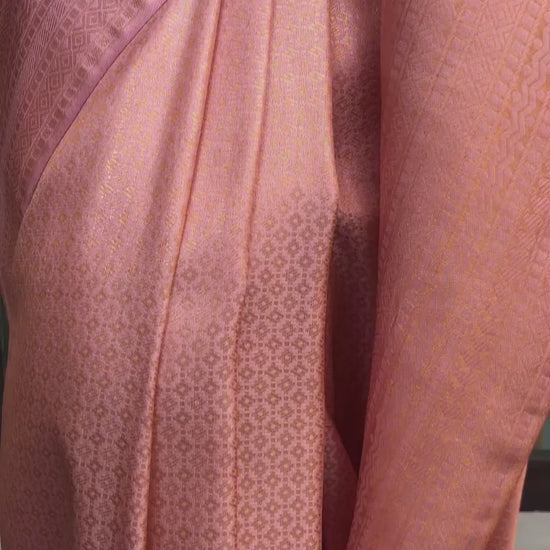 Rich in look and classy in design this taffy pink saree is adorned with a mesmerizing jacquard pattern and a glittering border