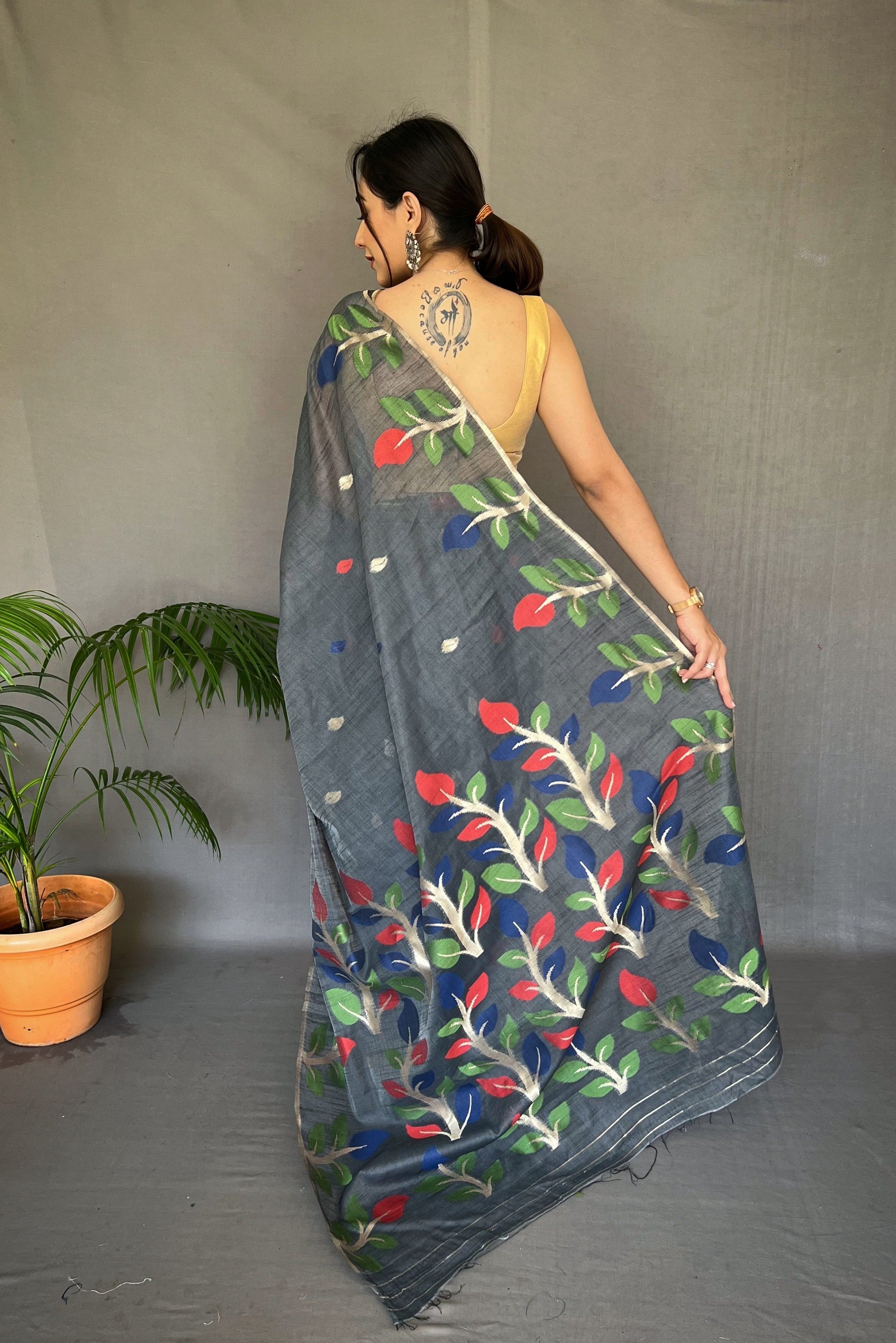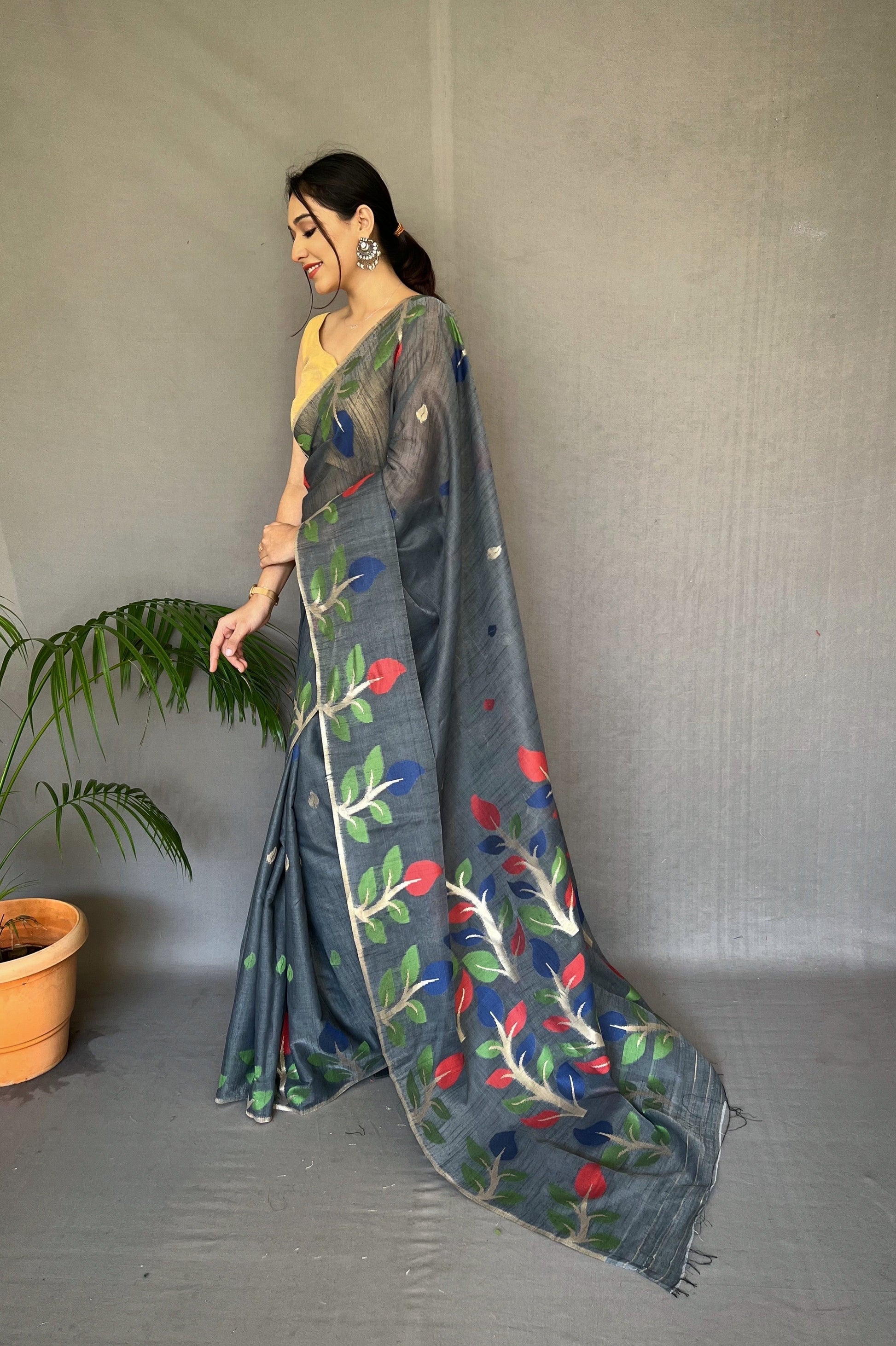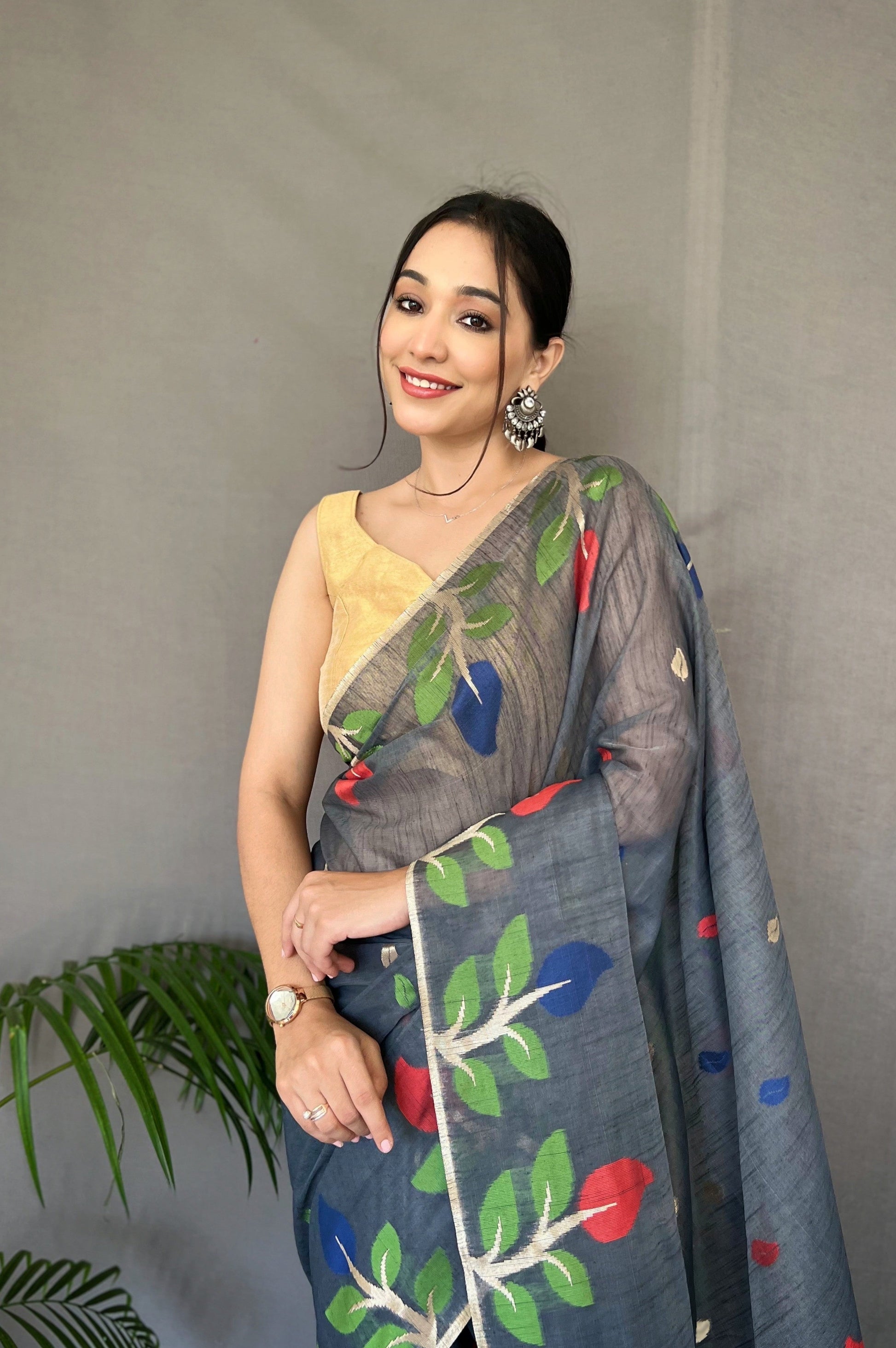 This unique floral saree features a floral woven border crafted with rich and vibrant pattern. The saree is paired with plain blouse for a complete look.