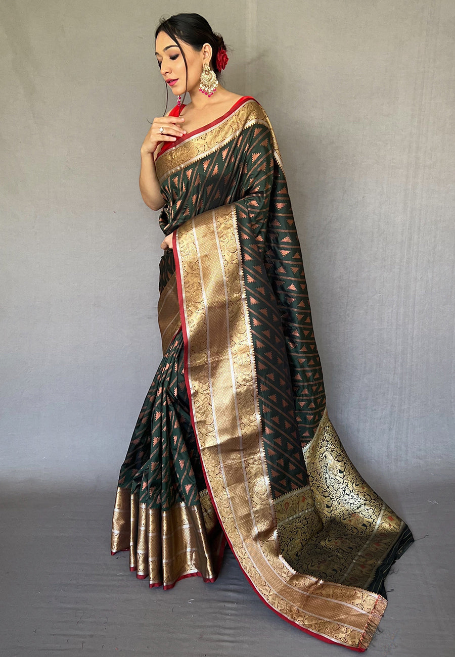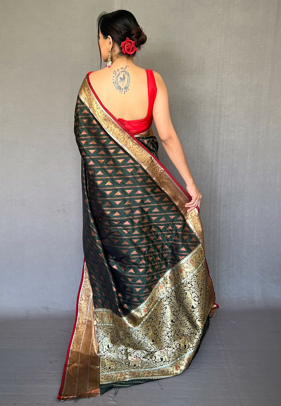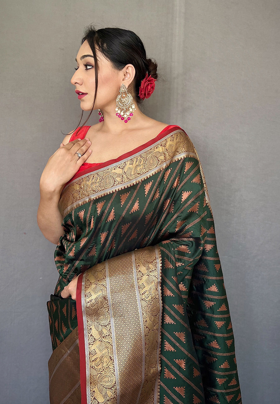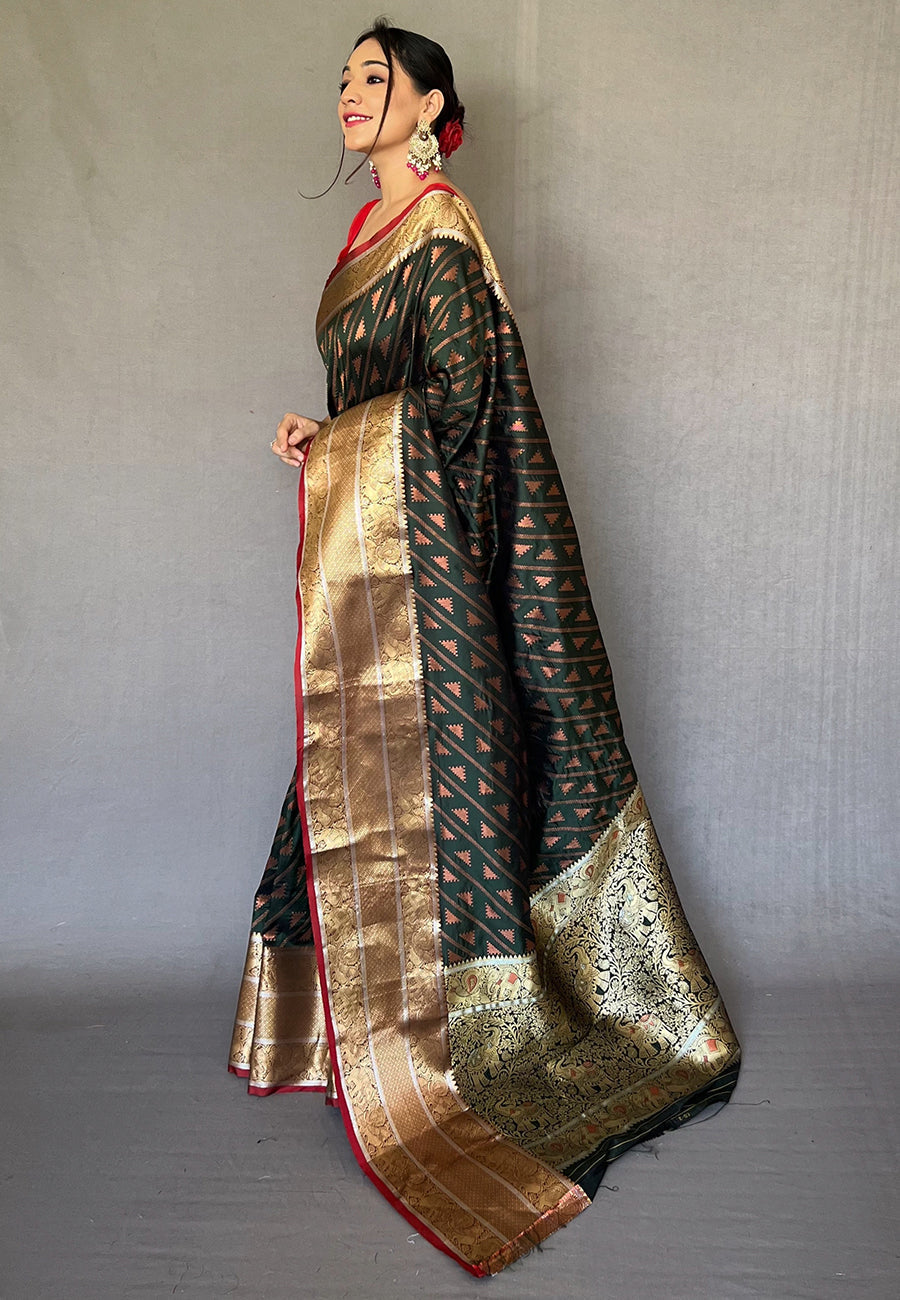 Bottle Green Aanchal Banarasi Silk Leheriya Copper Zari Woven Saree