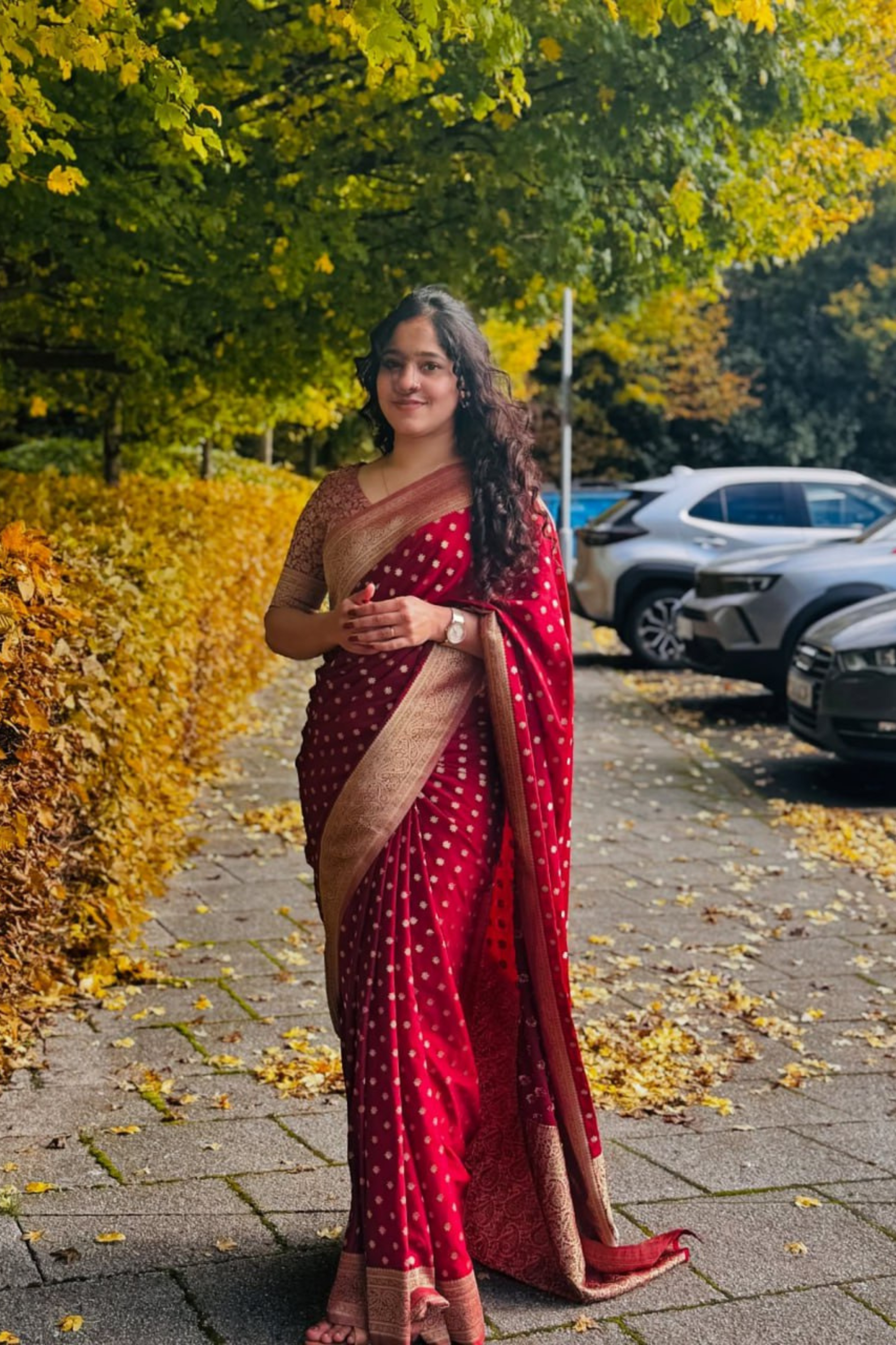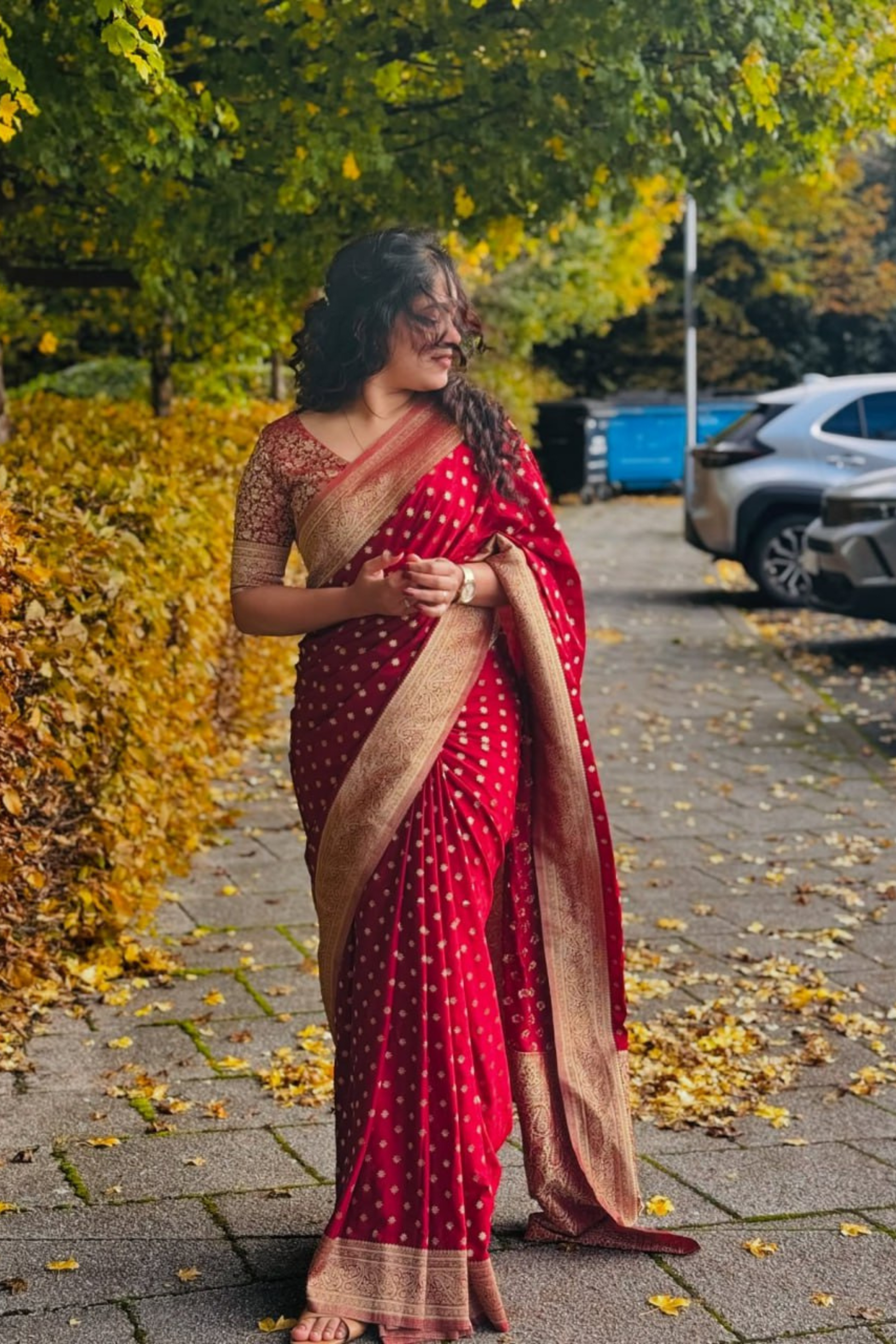 A timeless masterpiece, this Banarasi Silk Saree features an enchanting red base with intricate golden zari motifs, reflecting heritage craftsmanship. The regal border, adorned with traditional patterns, adds to its opulence. This saree is a perfect pick for grand occasions, weddings, and festivities.