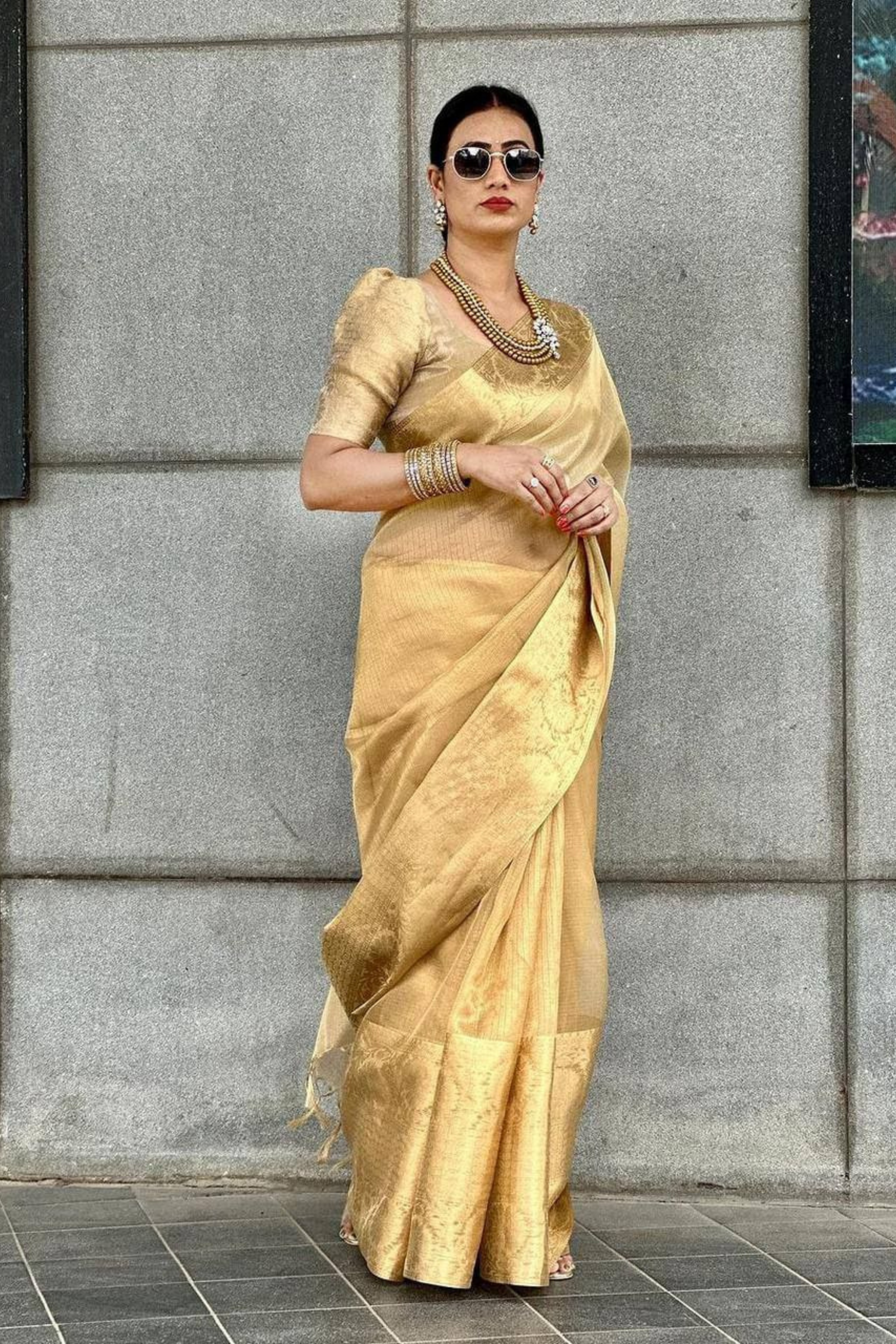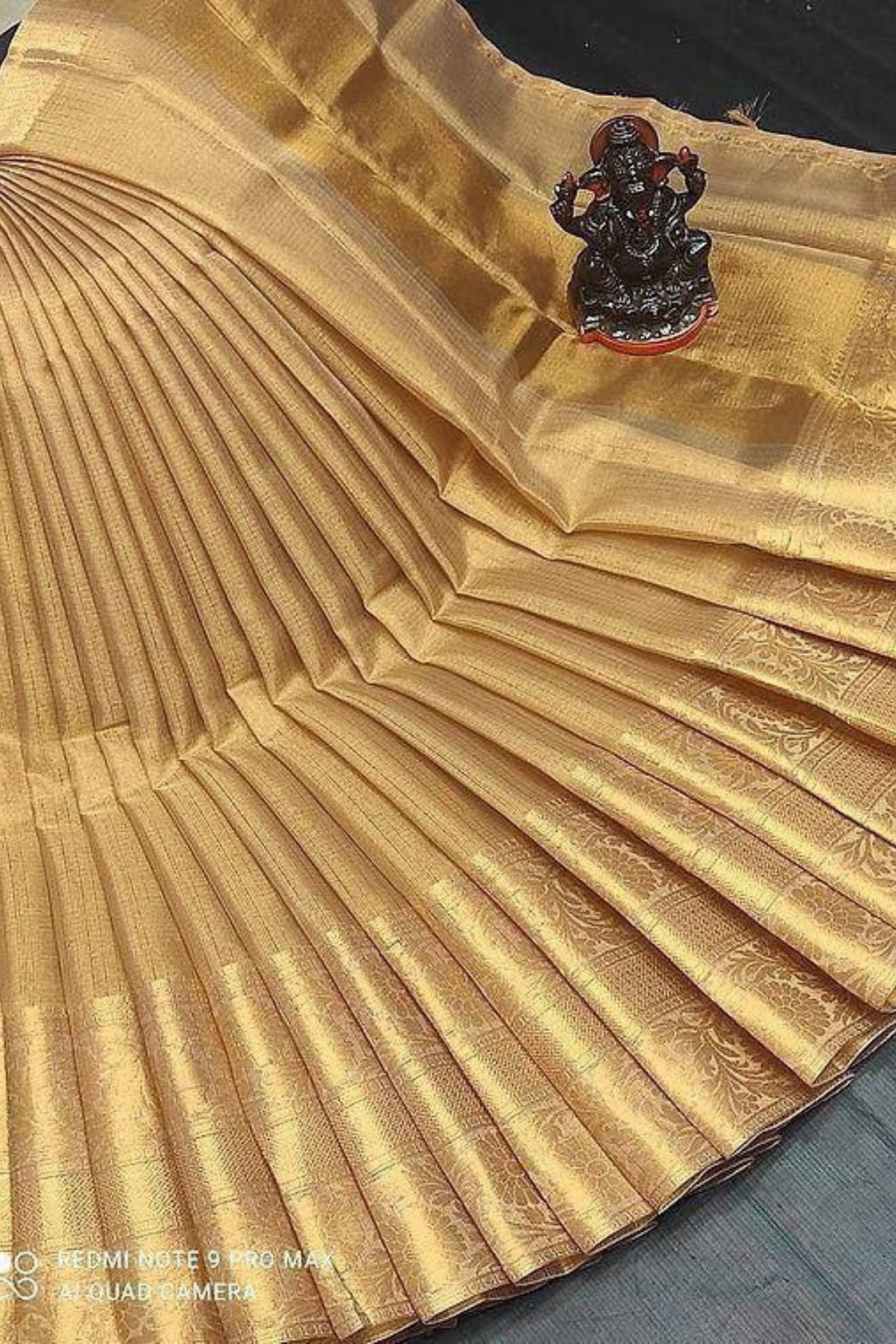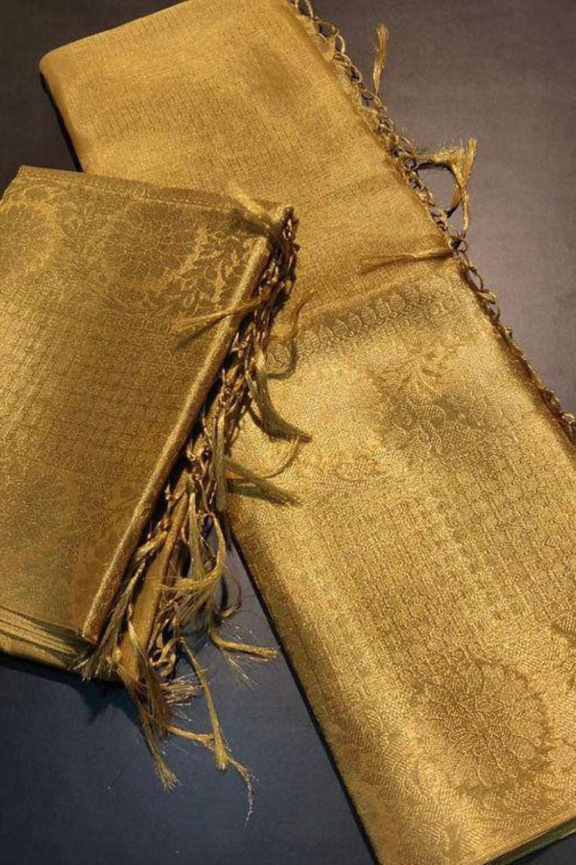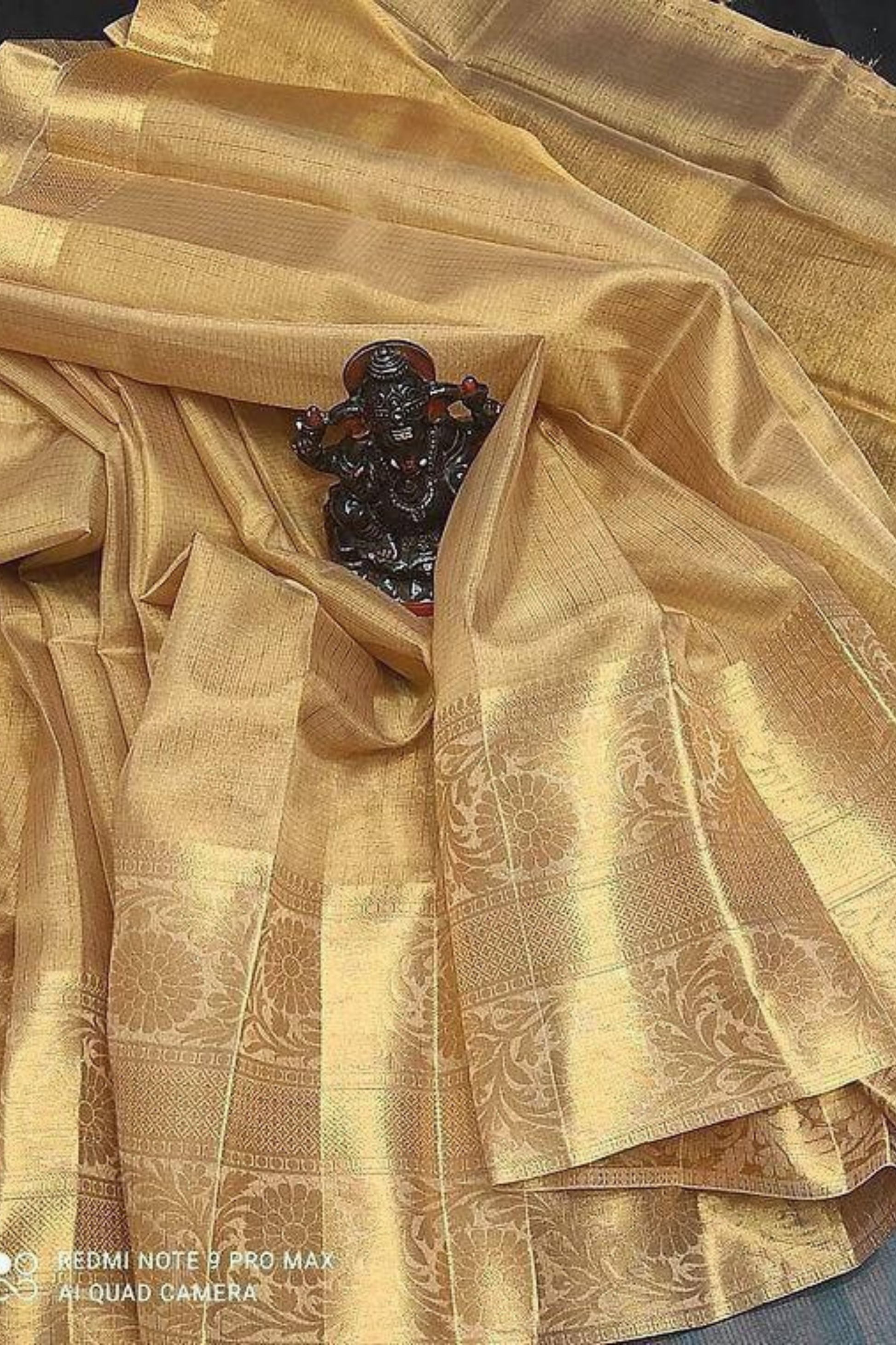 The saree radiates sophistication and charm, crafted meticulously in pure cotton silk. With its regal golden hue, adorned with intricate zari weaving and a subtle textured border, this saree reflects timeless elegance. Perfect for weddings, festive occasions, and cultural celebrations.