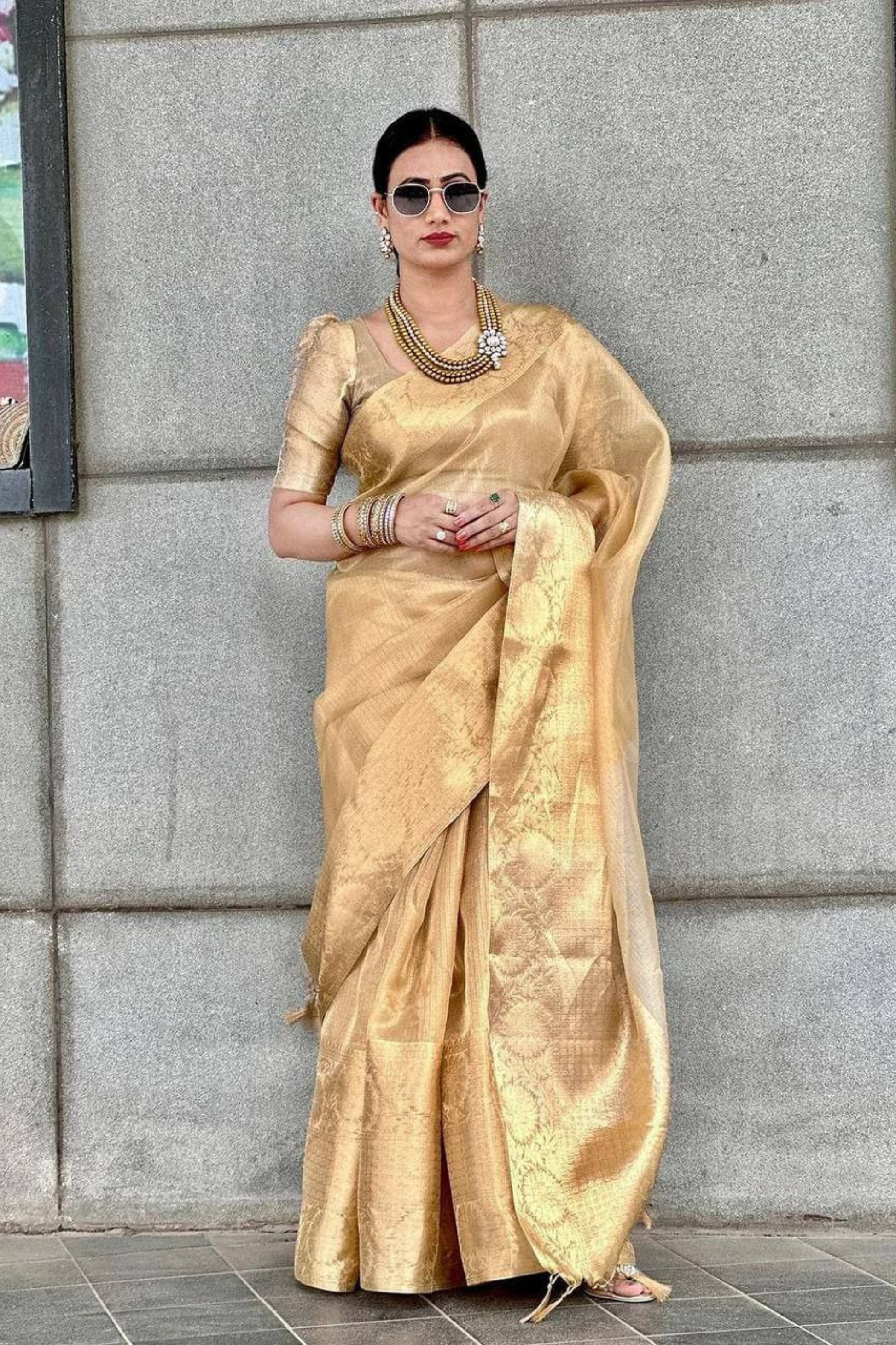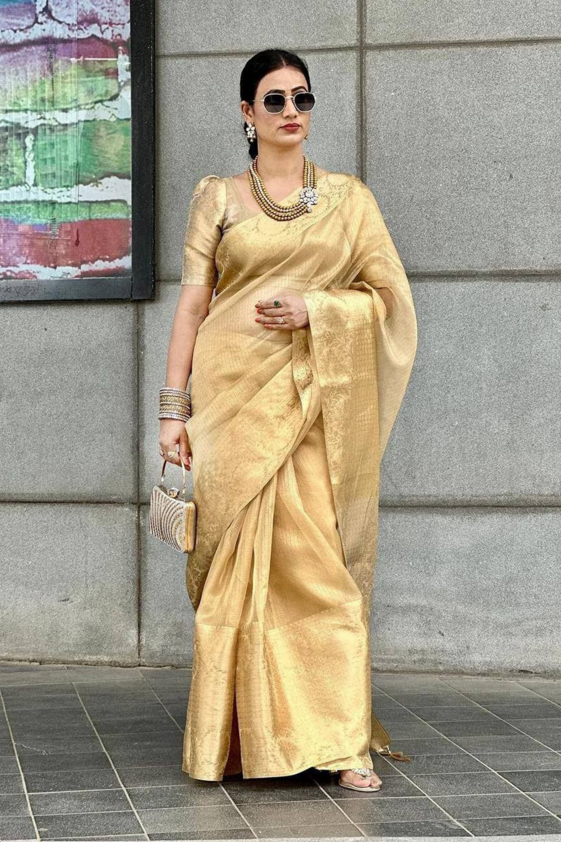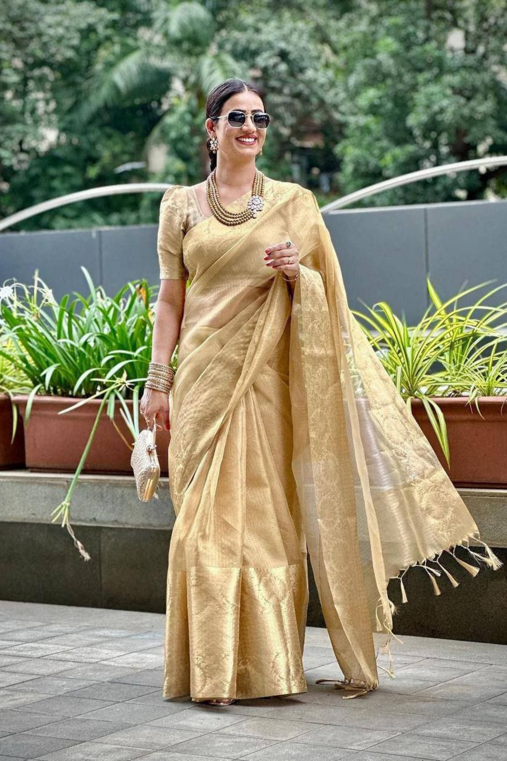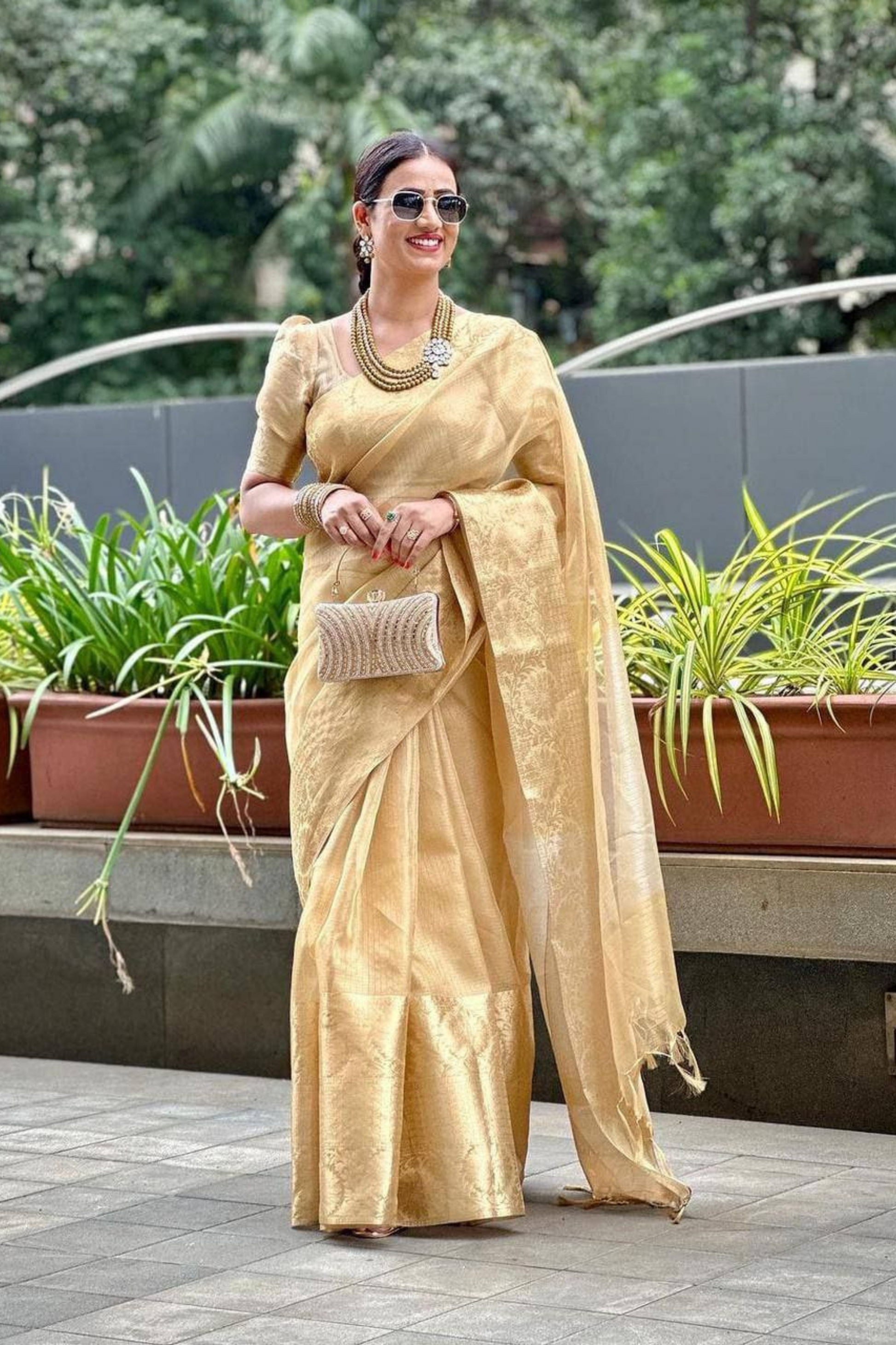 The saree radiates sophistication and charm, crafted meticulously in pure cotton silk. With its regal golden hue, adorned with intricate zari weaving and a subtle textured border, this saree reflects timeless elegance. Perfect for weddings, festive occasions, and cultural celebrations.