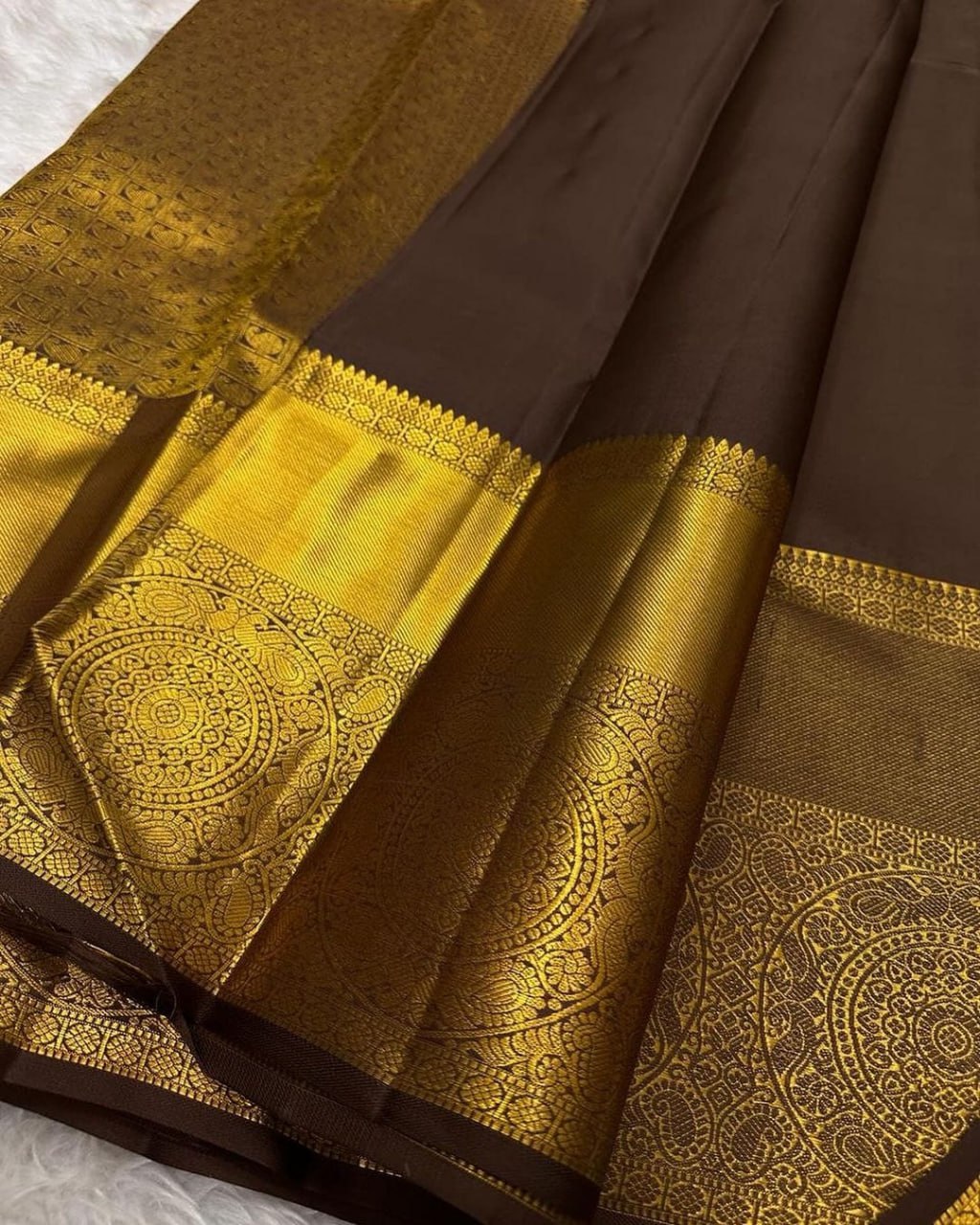 Chocolate Brown Banarasi Silk Saree With Charming Blouse Piece