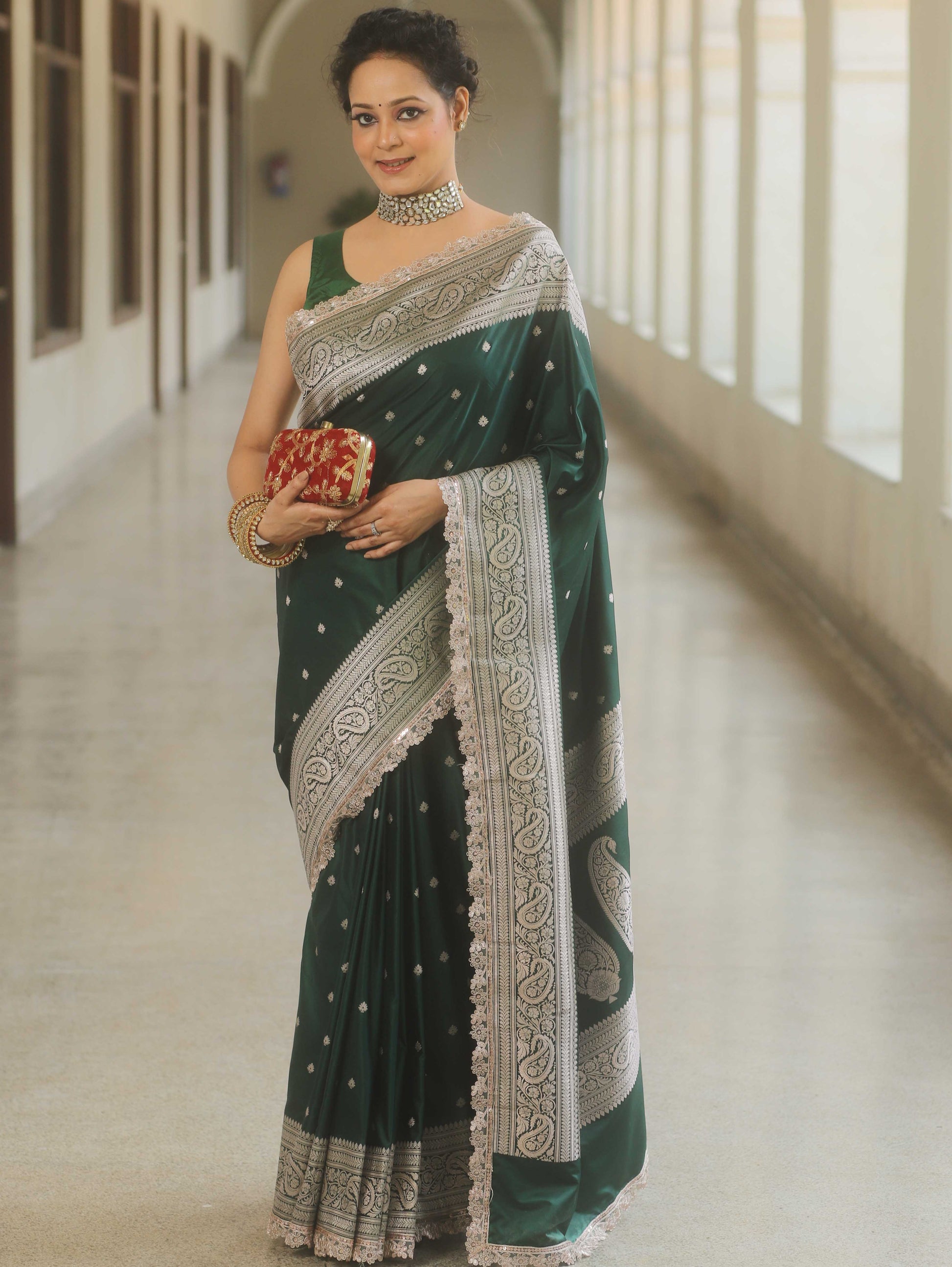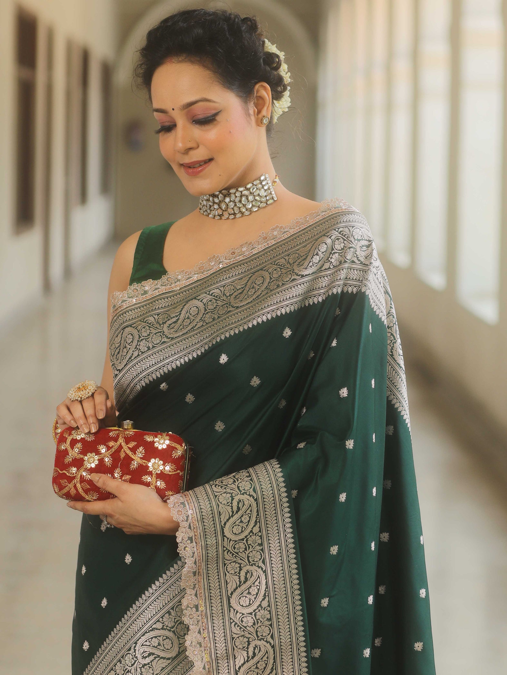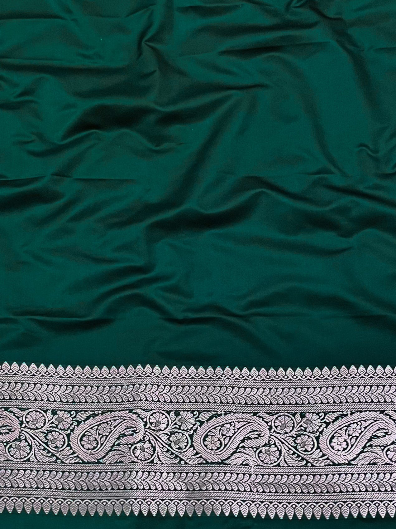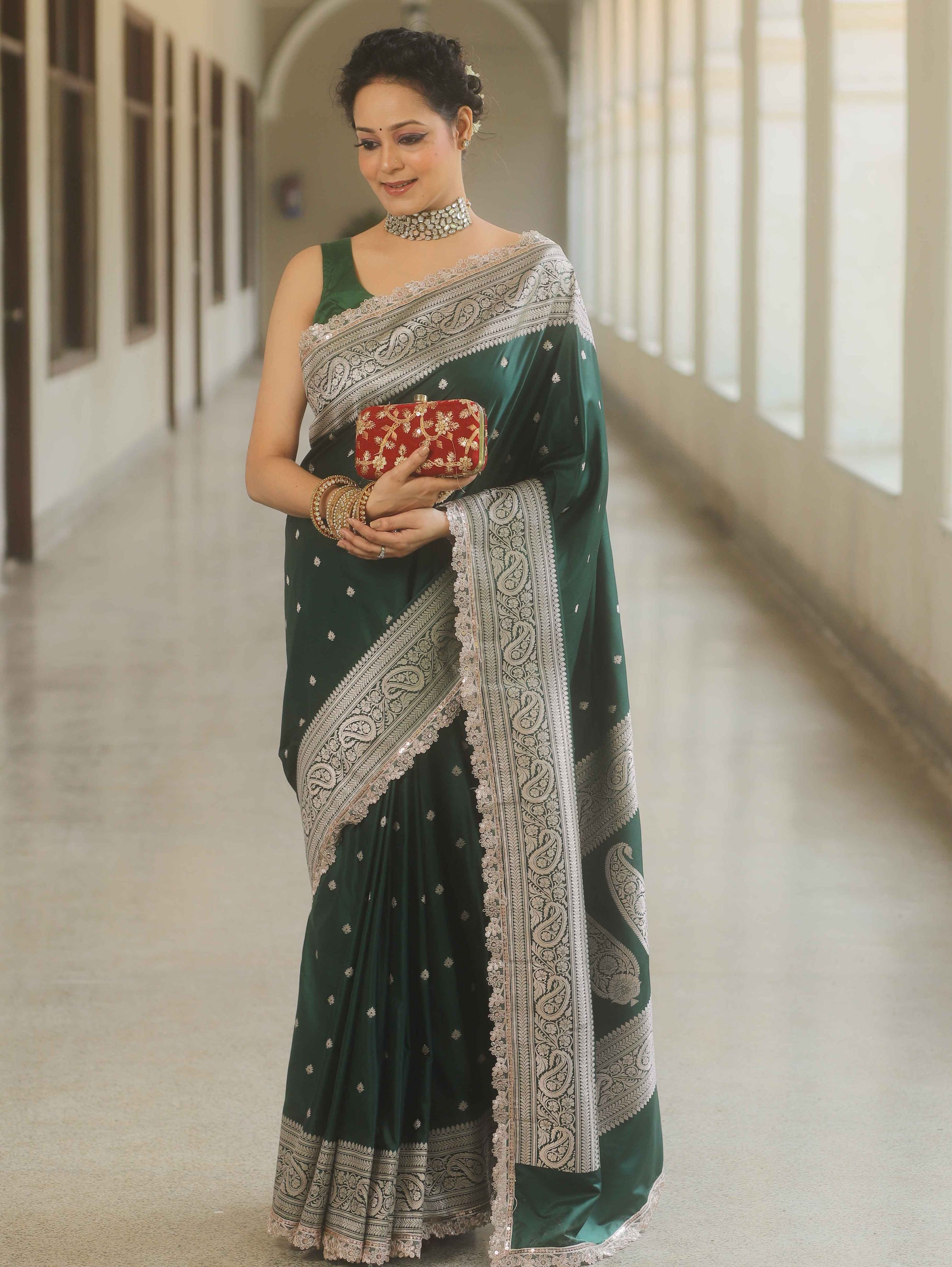 The "Emerald Glow" saree is an exquisite creation in luxurious Banarasi silk. It showcases a deep emerald green base adorned with intricate silver zari work and paisley motifs. The saree is bordered with a beautifully detailed lace, adding a touch of grace and sophistication. Perfect for weddings, festive occasions, and grand celebrations, this saree exudes timeless elegance.