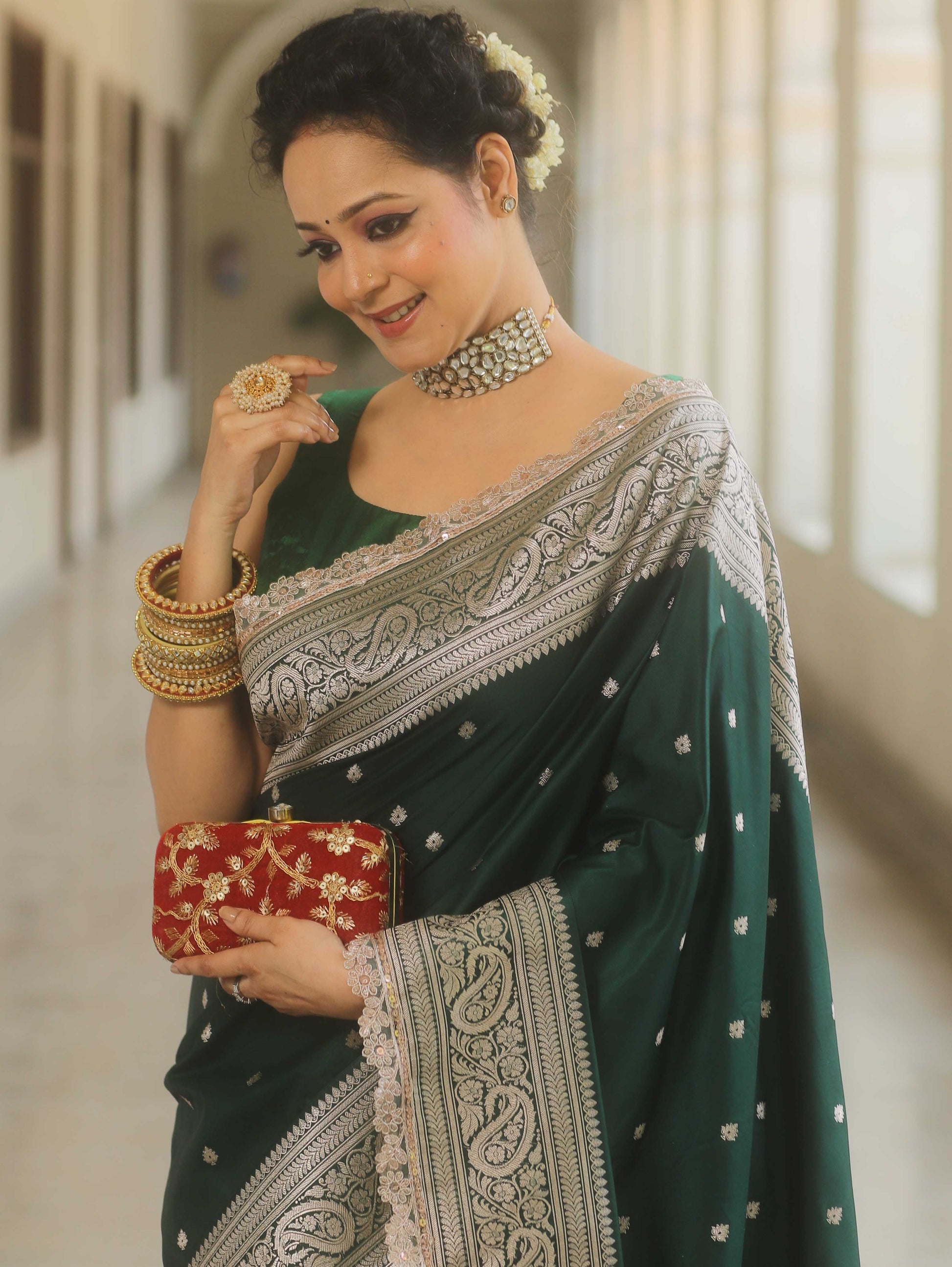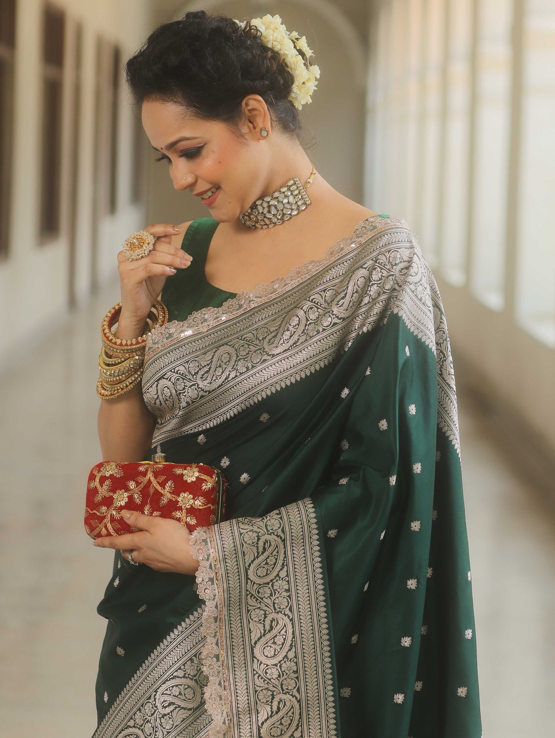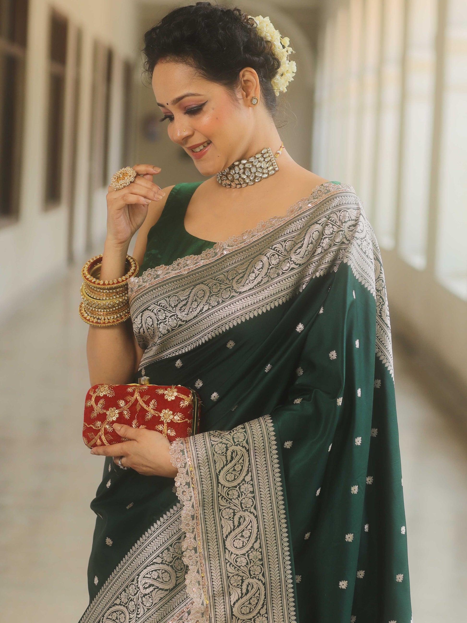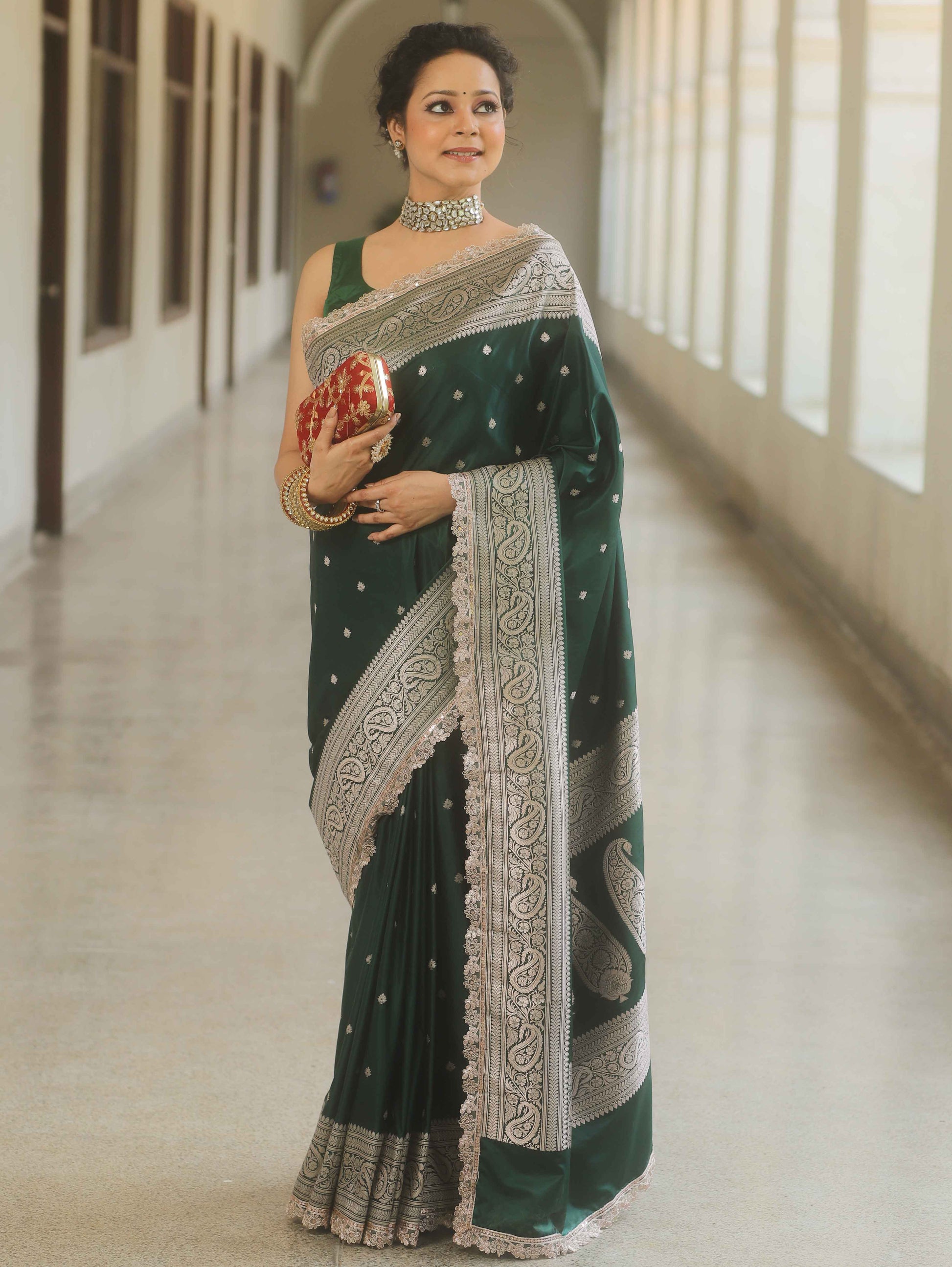 The "Emerald Glow" saree is an exquisite creation in luxurious Banarasi silk. It showcases a deep emerald green base adorned with intricate silver zari work and paisley motifs. The saree is bordered with a beautifully detailed lace, adding a touch of grace and sophistication. Perfect for weddings, festive occasions, and grand celebrations, this saree exudes timeless elegance.