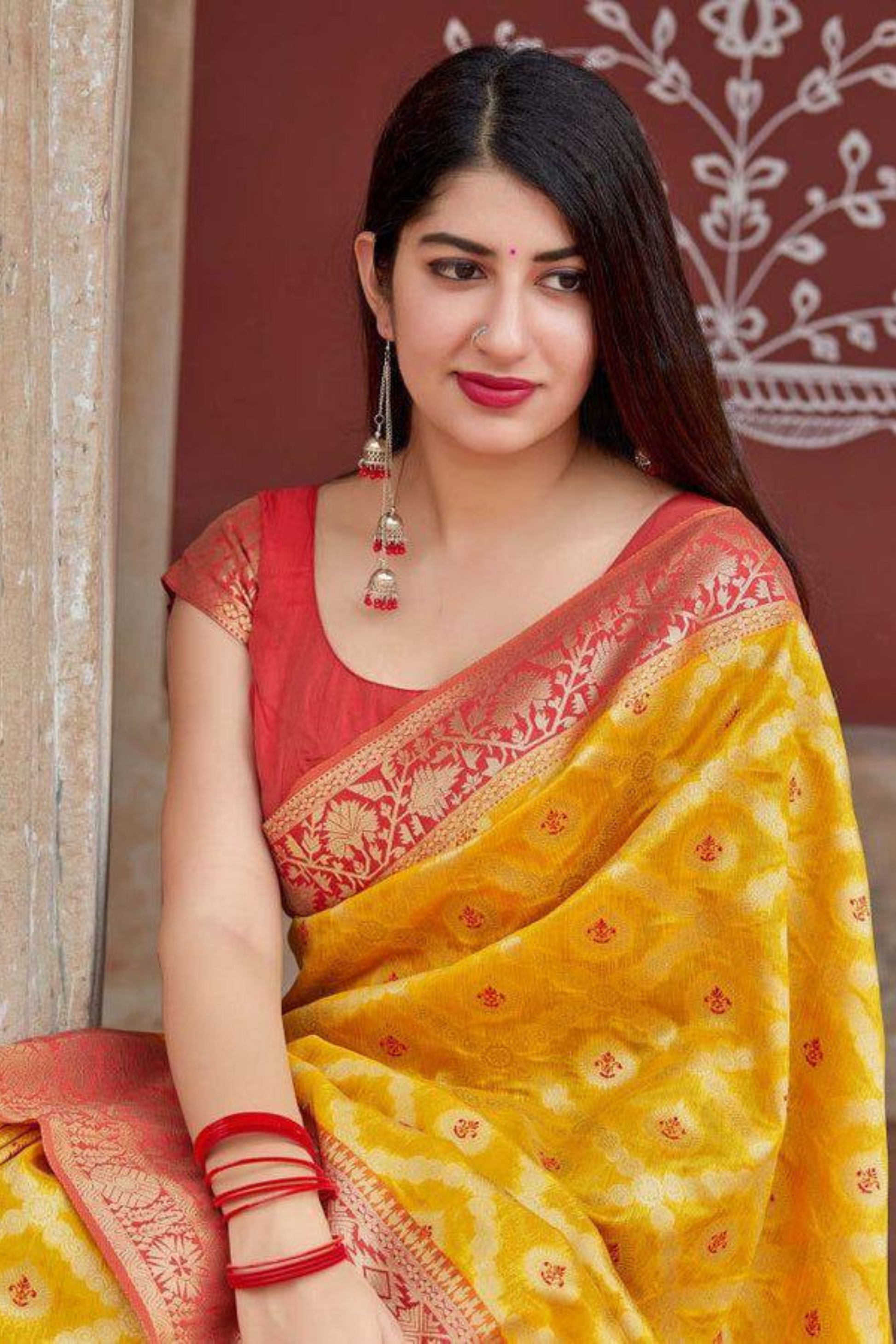 This saree is a radiant creation crafted in premium cotton silk. Its bright yellow body is adorned with intricate geometric patterns, while the contrasting red border showcases traditional motifs. Ideal for festive occasions and cultural events, this saree combines vibrancy with timeless elegance.