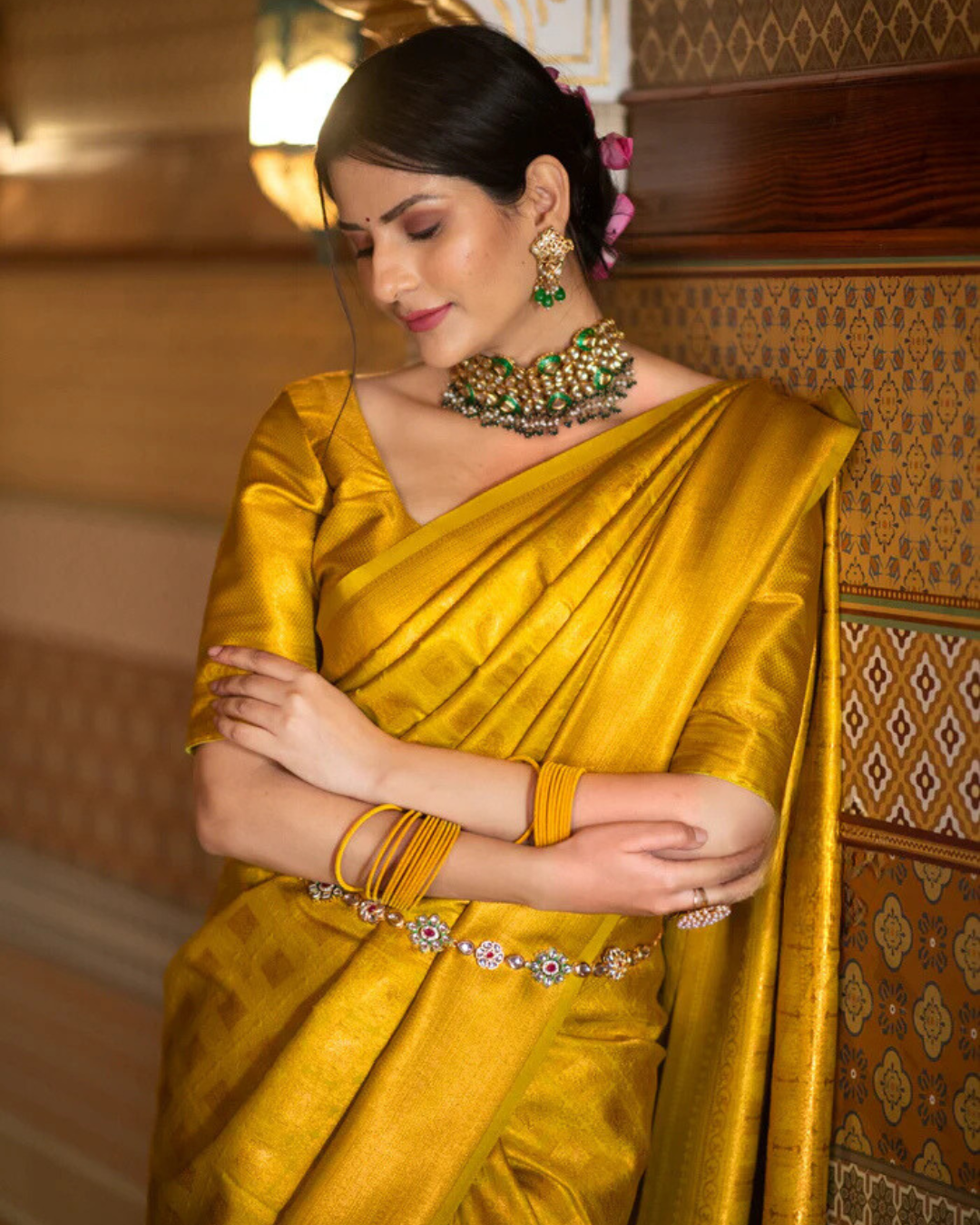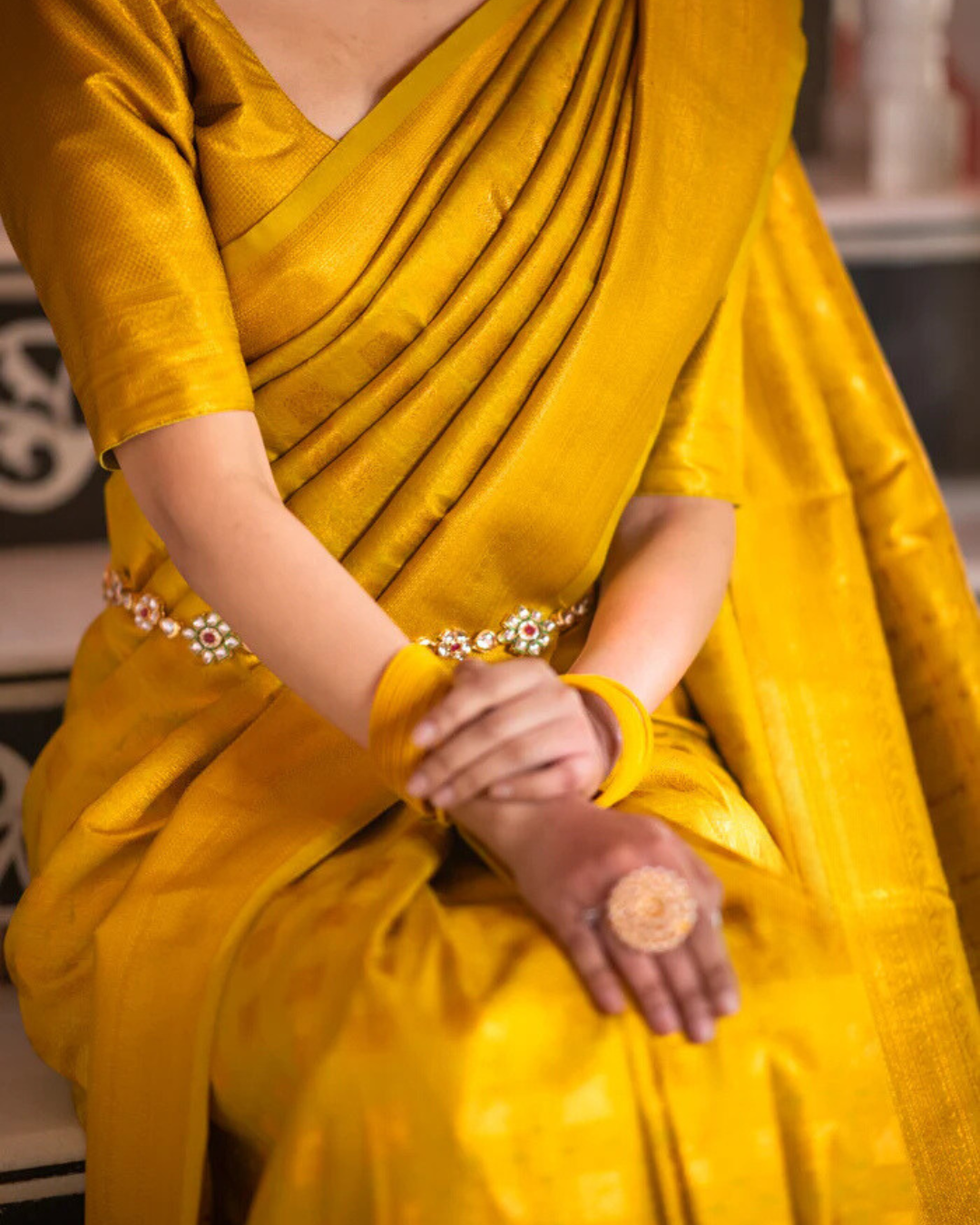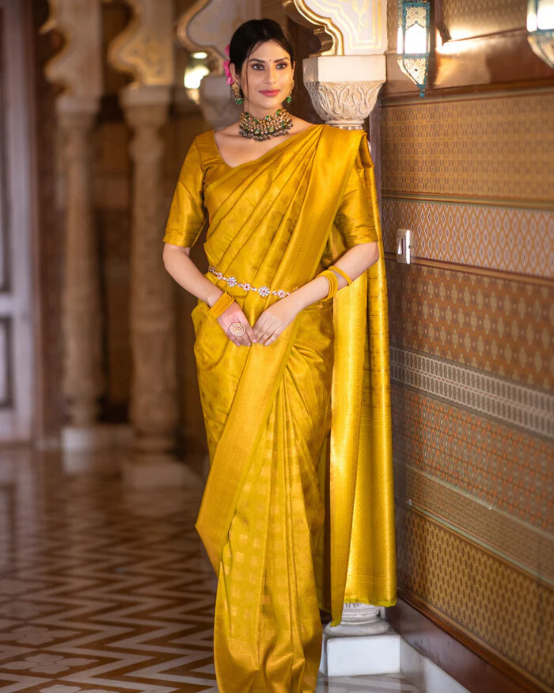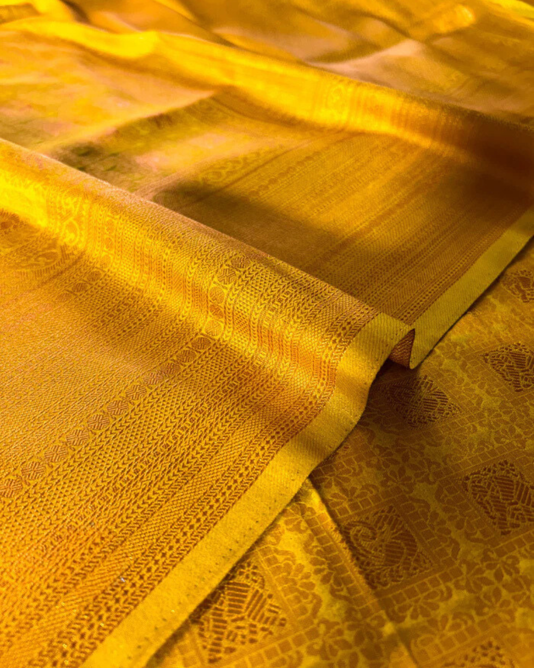 The "Golden Bloom" saree is a stunning blend of tradition and contemporary elegance. Crafted in luxurious Banarasi silk, it radiates a golden hue with intricate zari patterns and a rich texture. The finely woven pallu and graceful border make it an exquisite choice for celebrations and festive occasions.
