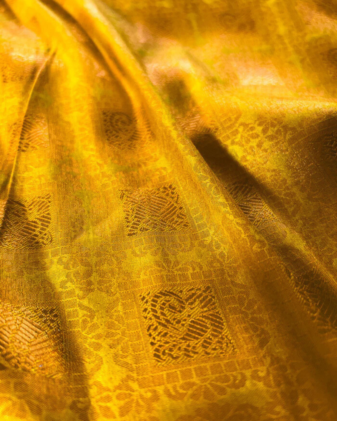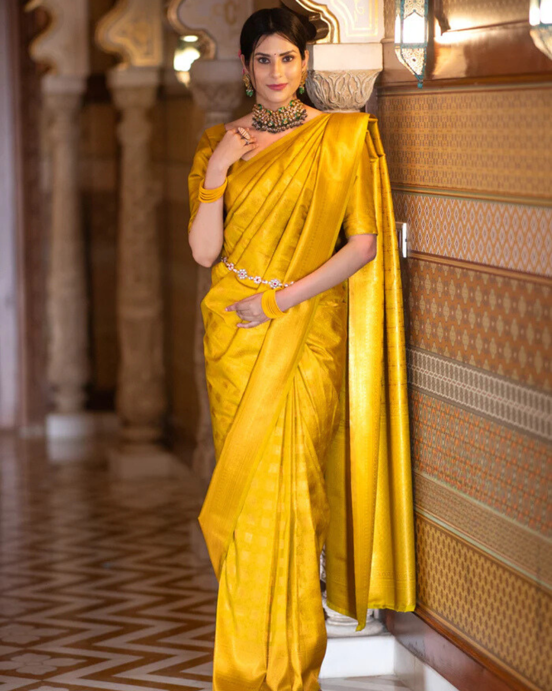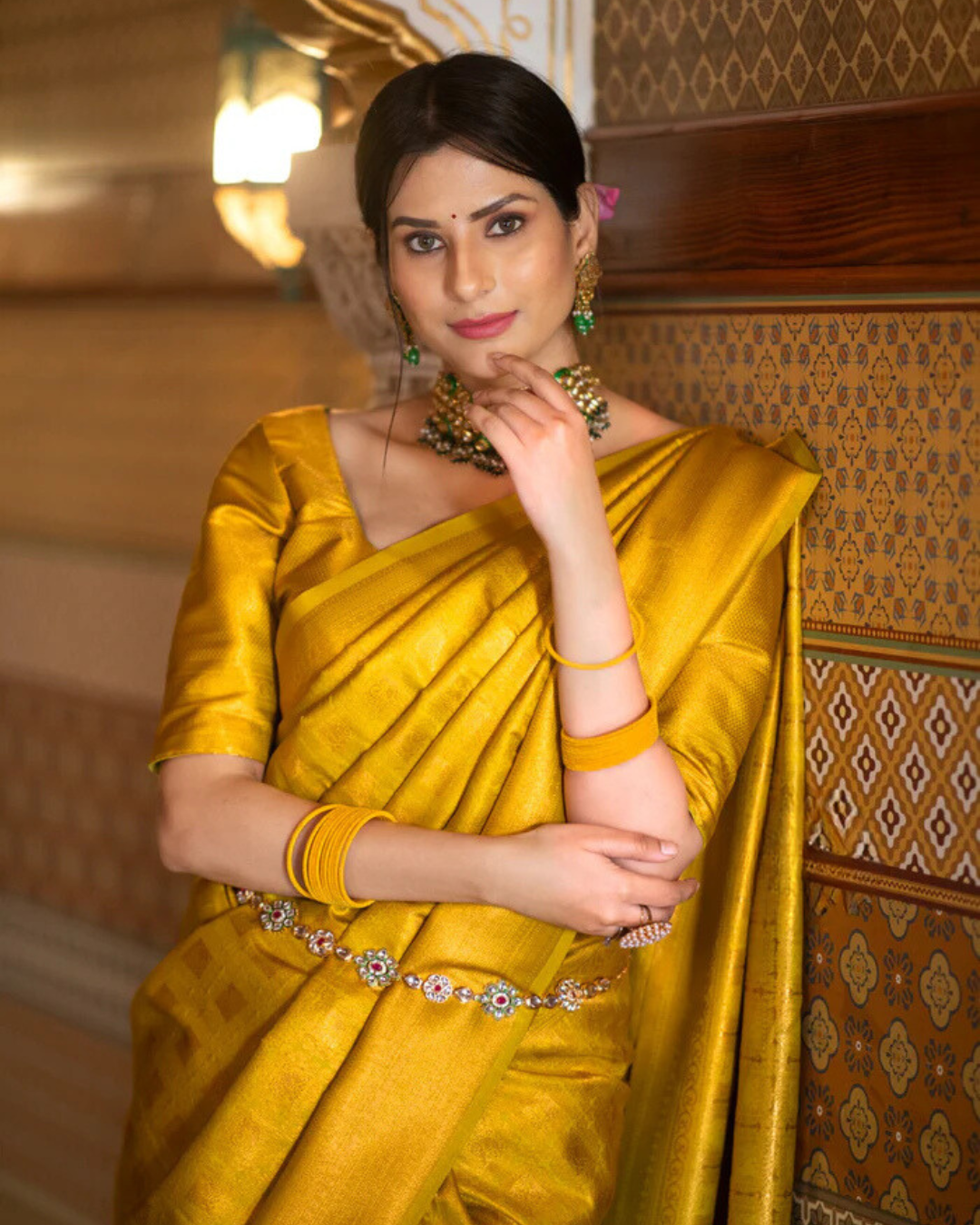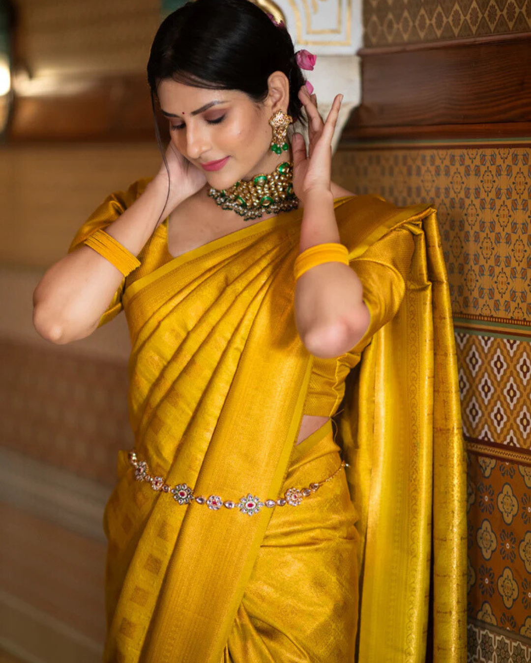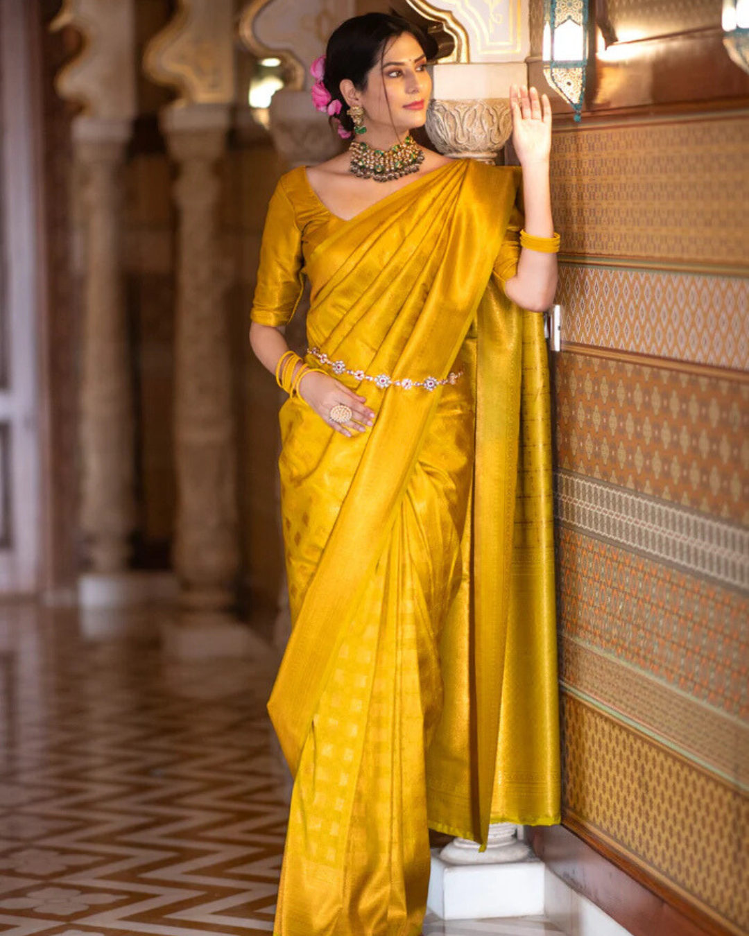 The "Golden Bloom" saree is a stunning blend of tradition and contemporary elegance. Crafted in luxurious Banarasi silk, it radiates a golden hue with intricate zari patterns and a rich texture. The finely woven pallu and graceful border make it an exquisite choice for celebrations and festive occasions.