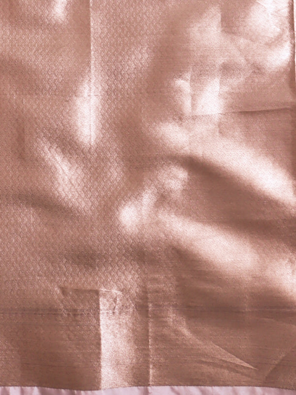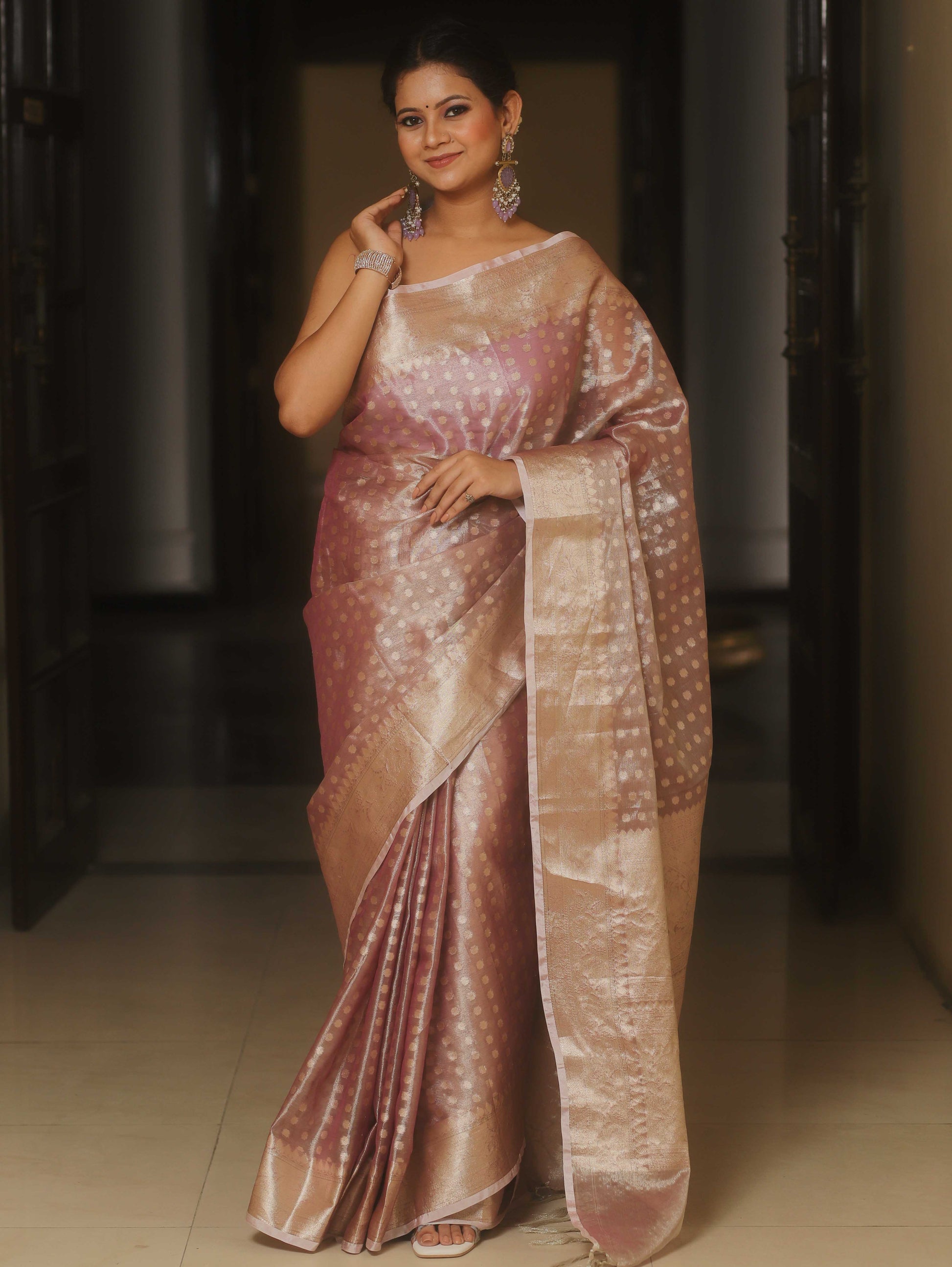 The "Golden Blush" saree from Zariknyaa is a refined masterpiece of handwoven silk. This stunning saree features a subtle blush base with intricate golden polka-dot zari work, complemented by a shimmering border. The harmonious interplay of blush and gold exudes elegance and timeless sophistication, making it an impeccable choice for festive occasions, weddings, and celebratory events.