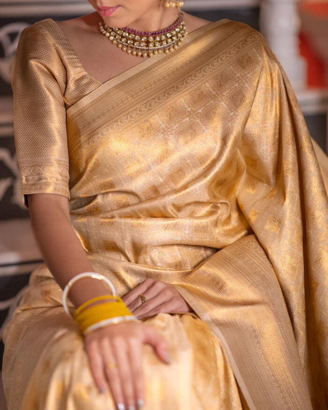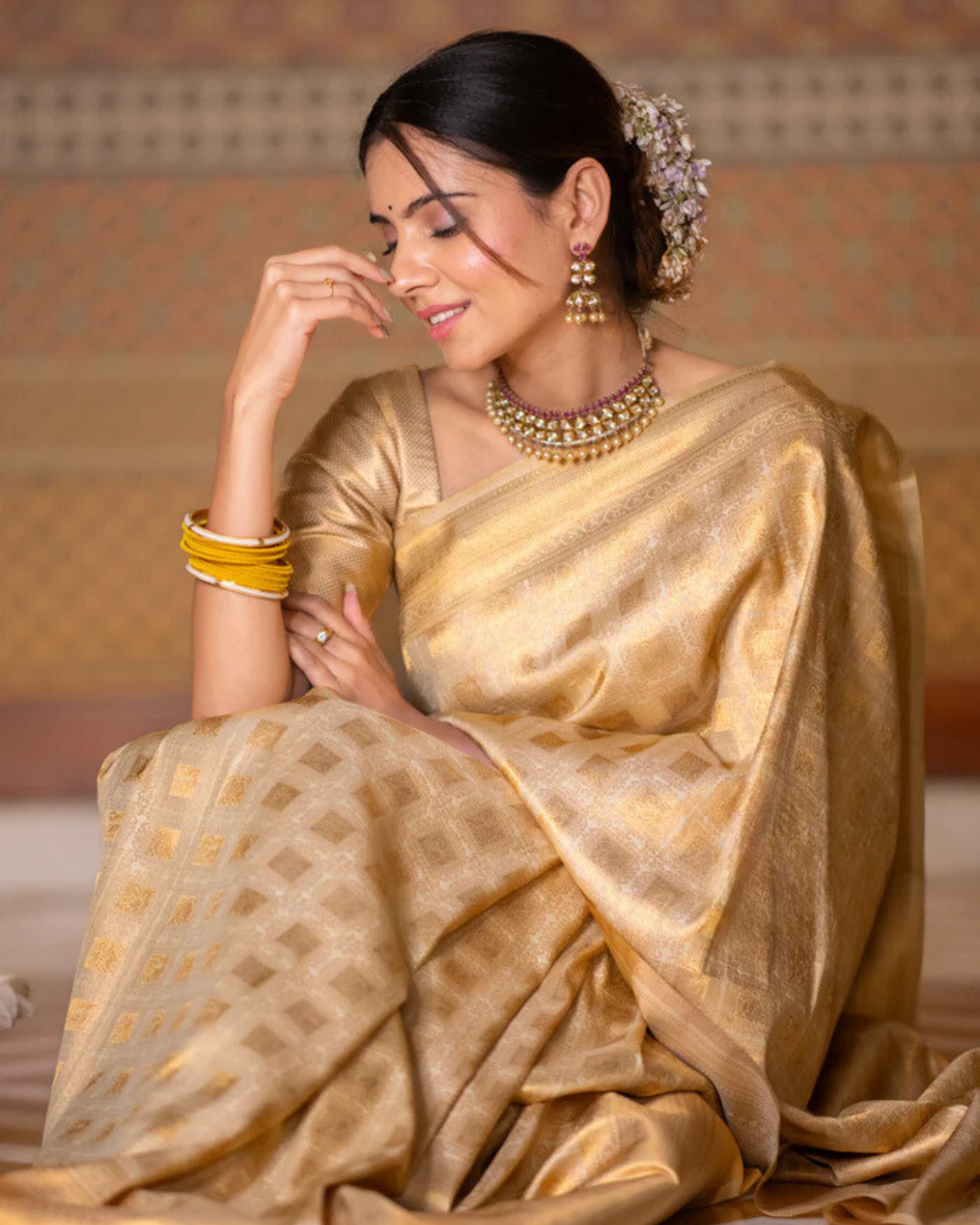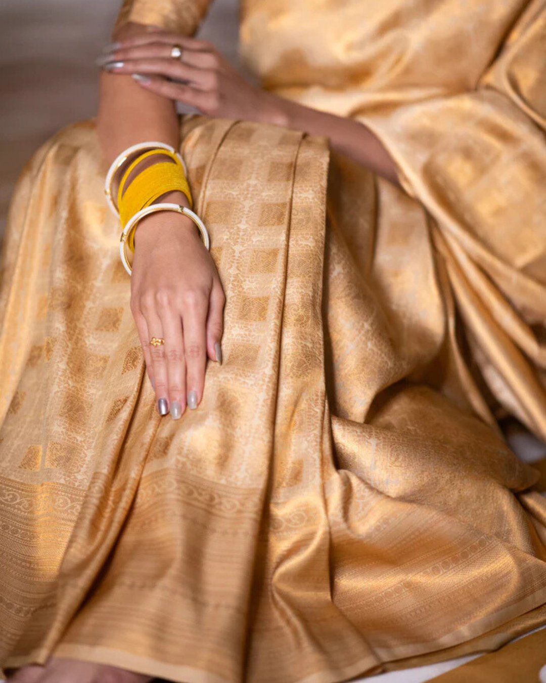 The "Golden Radiance" saree is an exquisite piece crafted in luxurious Banarasi silk. Featuring a golden hue adorned with intricate woven motifs, this saree radiates timeless elegance. Its rich texture and subtle sheen make it the perfect attire for weddings, festive occasions, and grand celebrations.