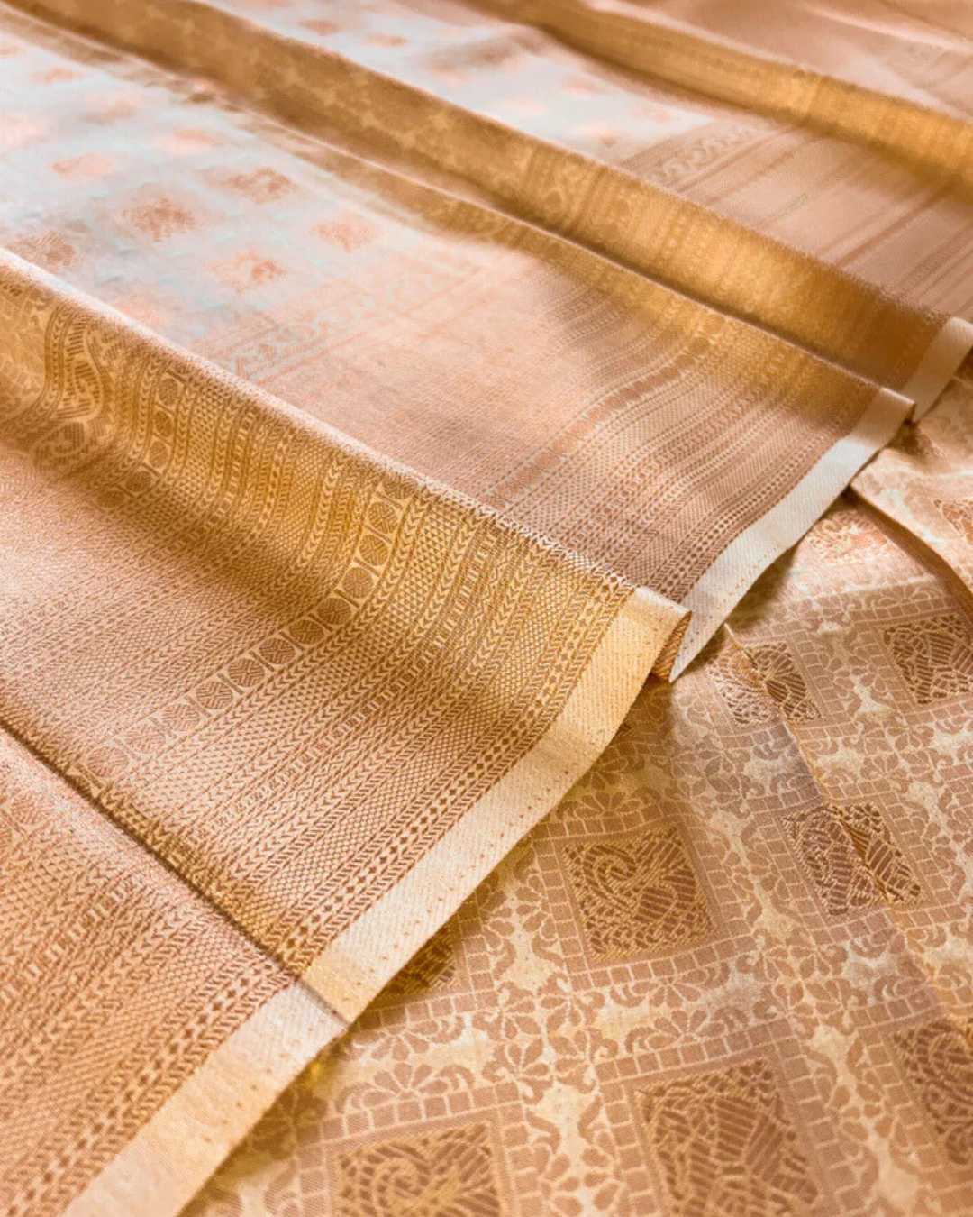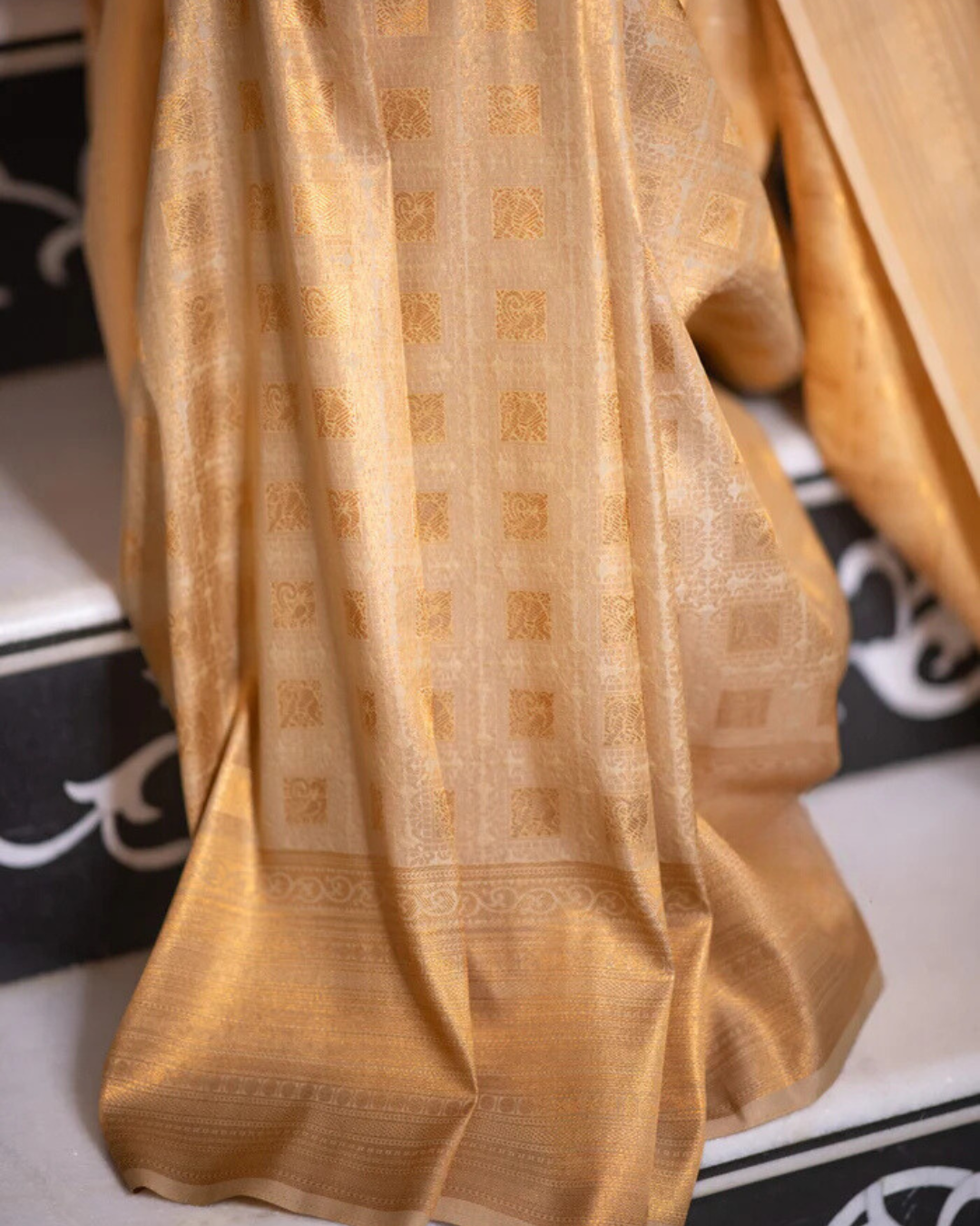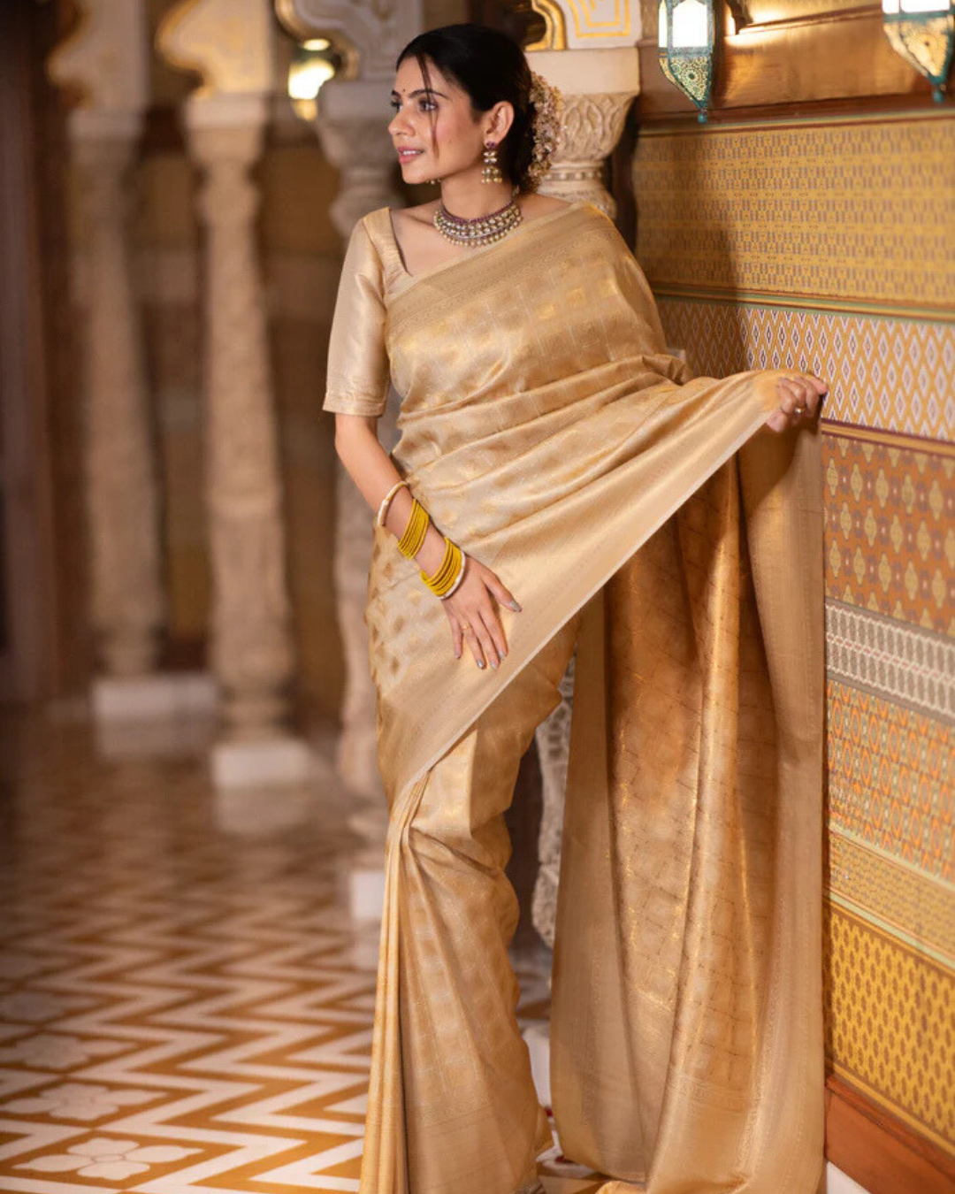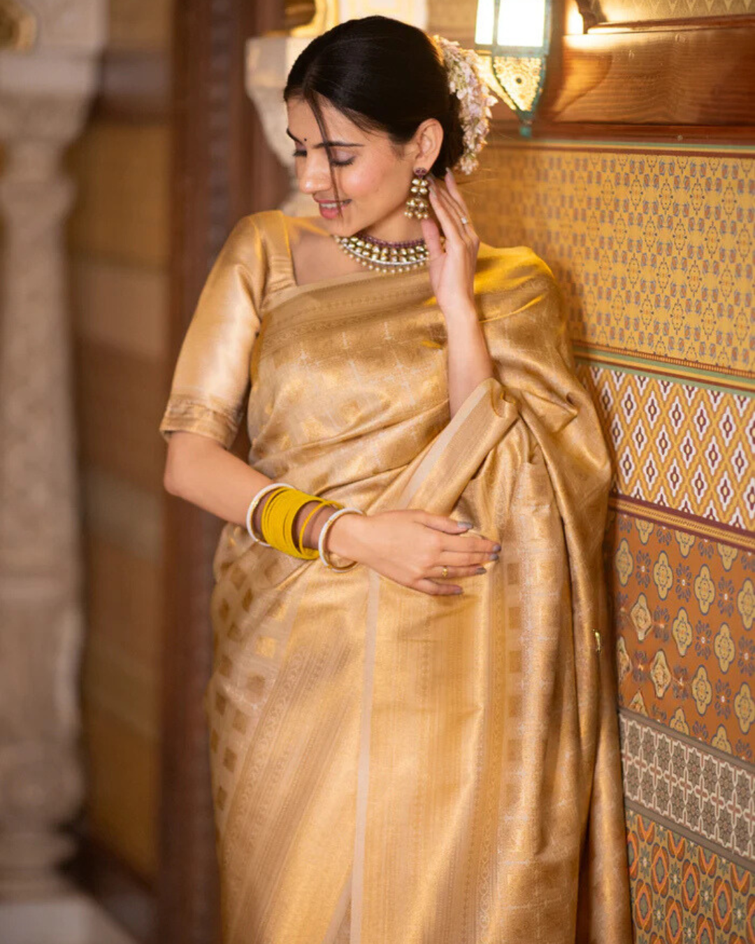 The "Golden Radiance" saree is an exquisite piece crafted in luxurious Banarasi silk. Featuring a golden hue adorned with intricate woven motifs, this saree radiates timeless elegance. Its rich texture and subtle sheen make it the perfect attire for weddings, festive occasions, and grand celebrations.