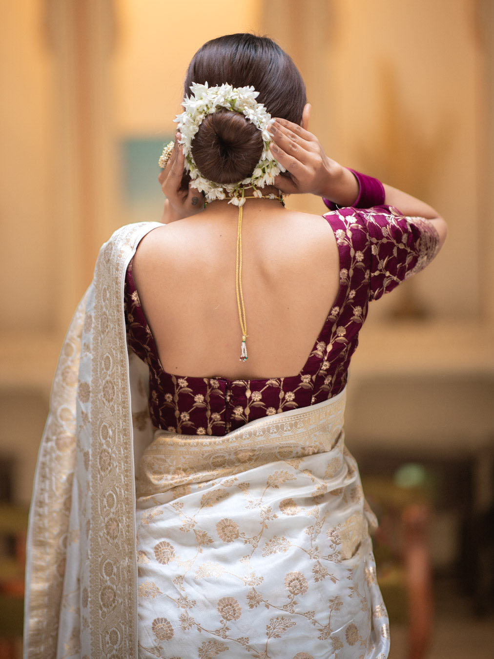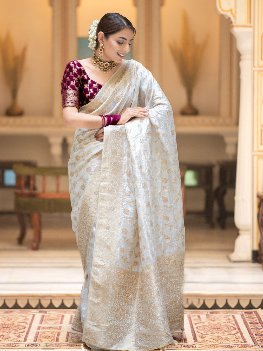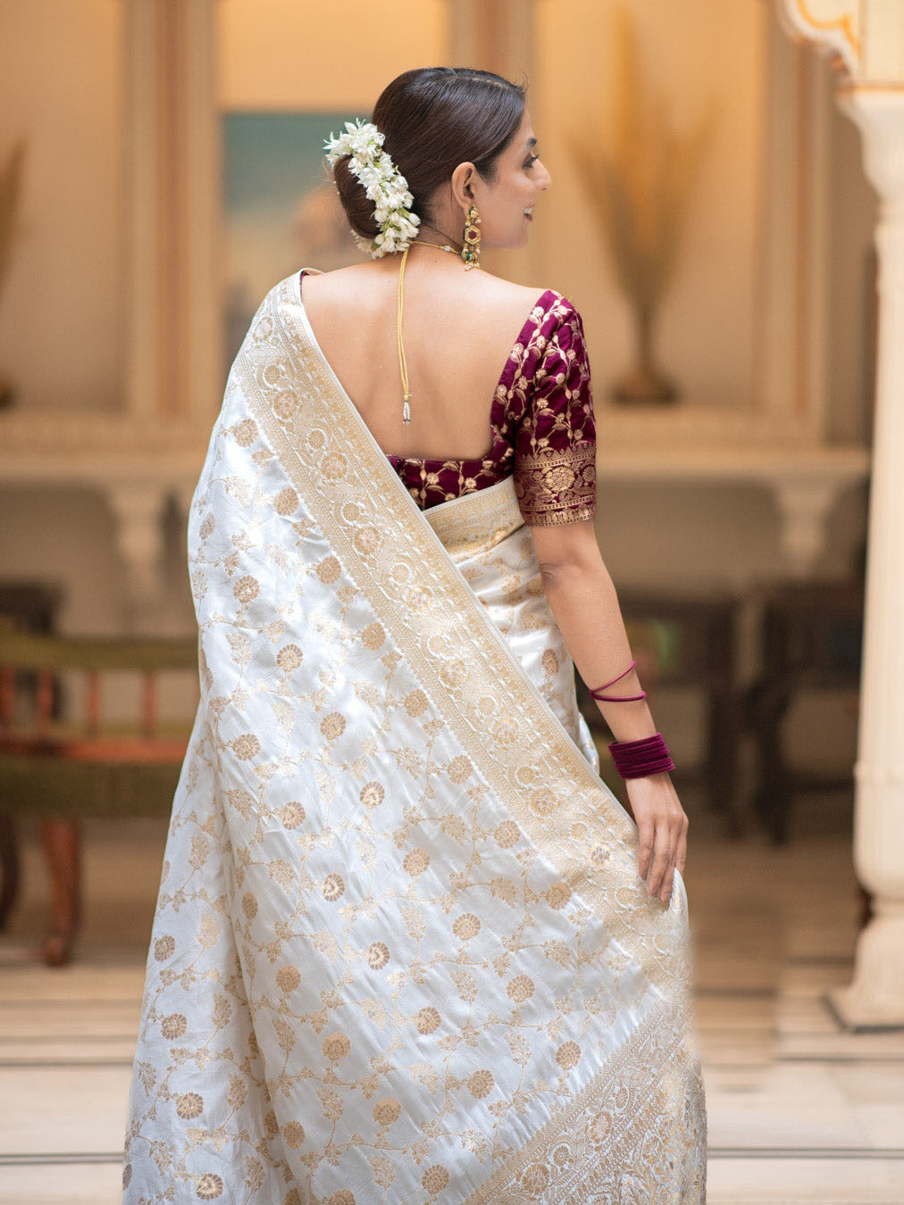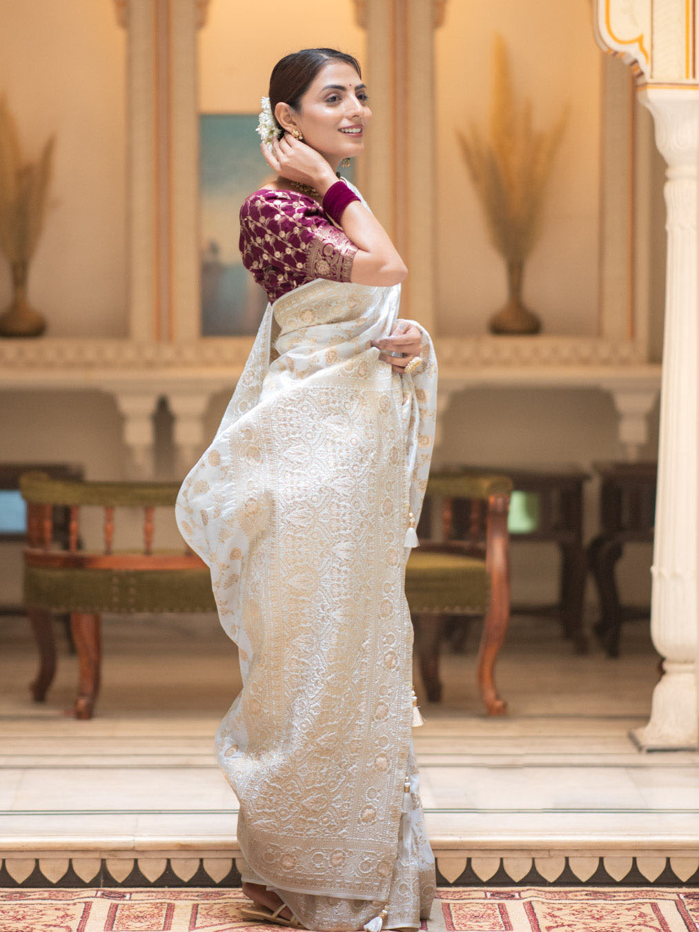 Hira White Banarasi Silk Saree With Amazing Blouse Piece