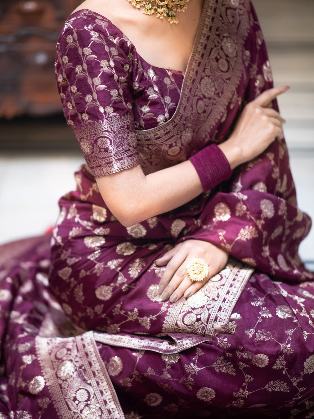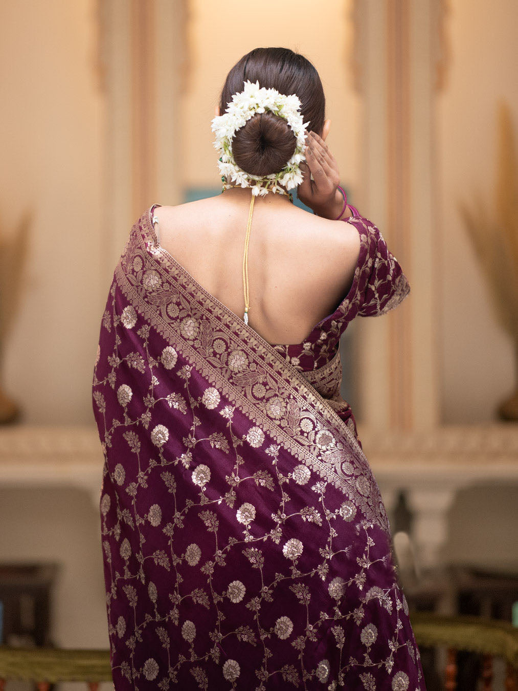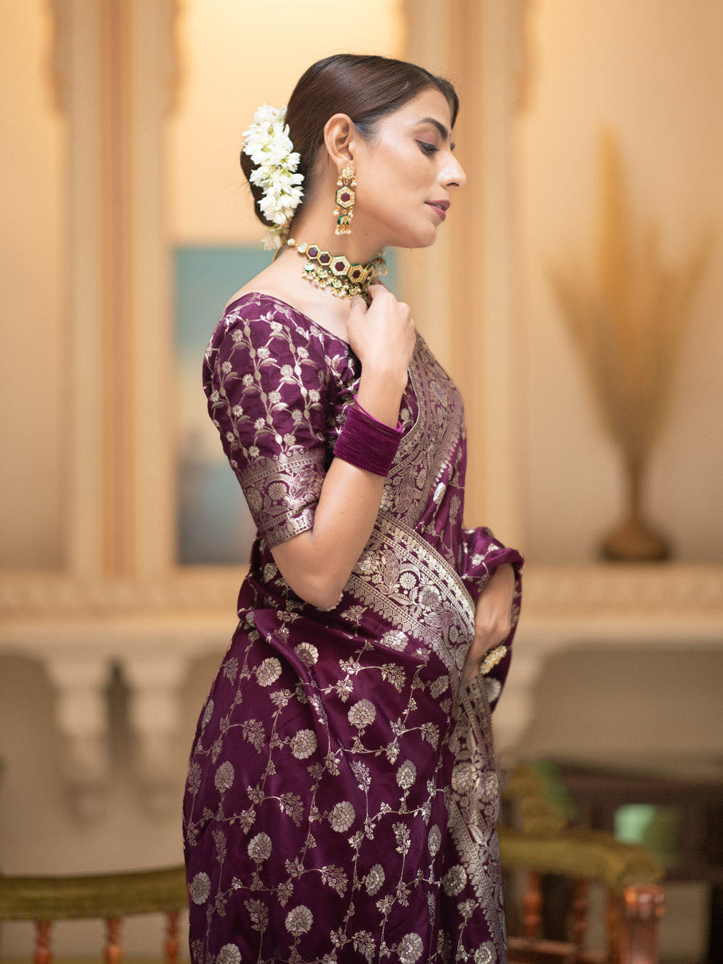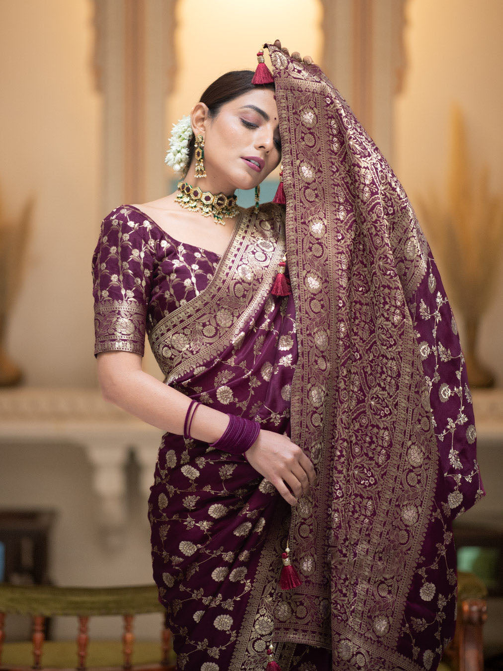 Hira Wine Banarasi Silk Saree With Amazing Blouse Piece