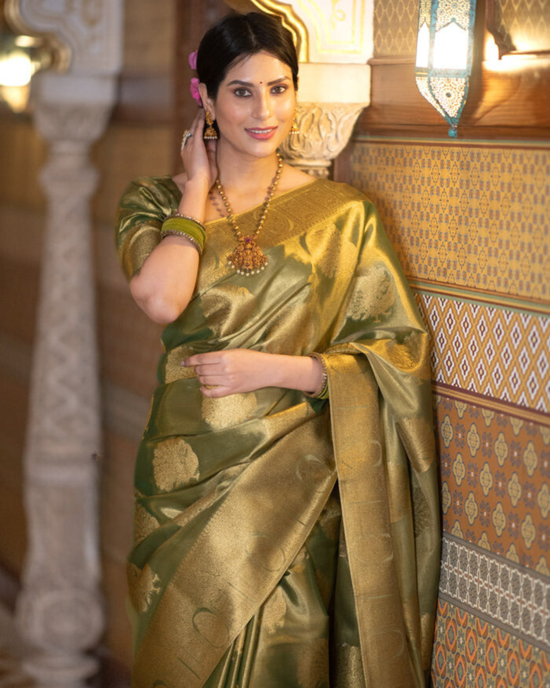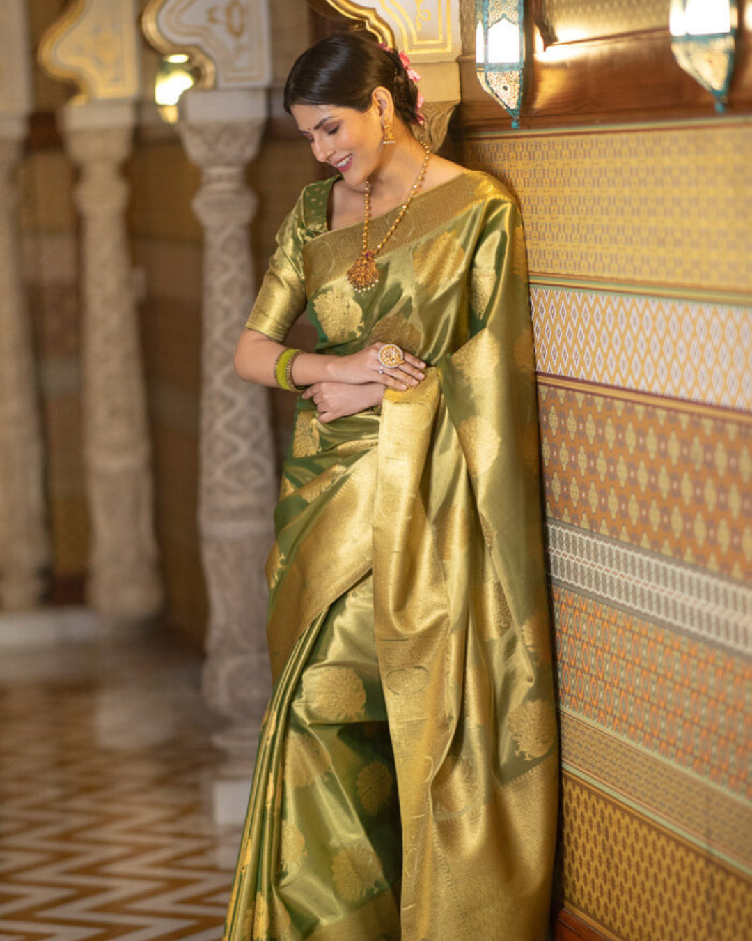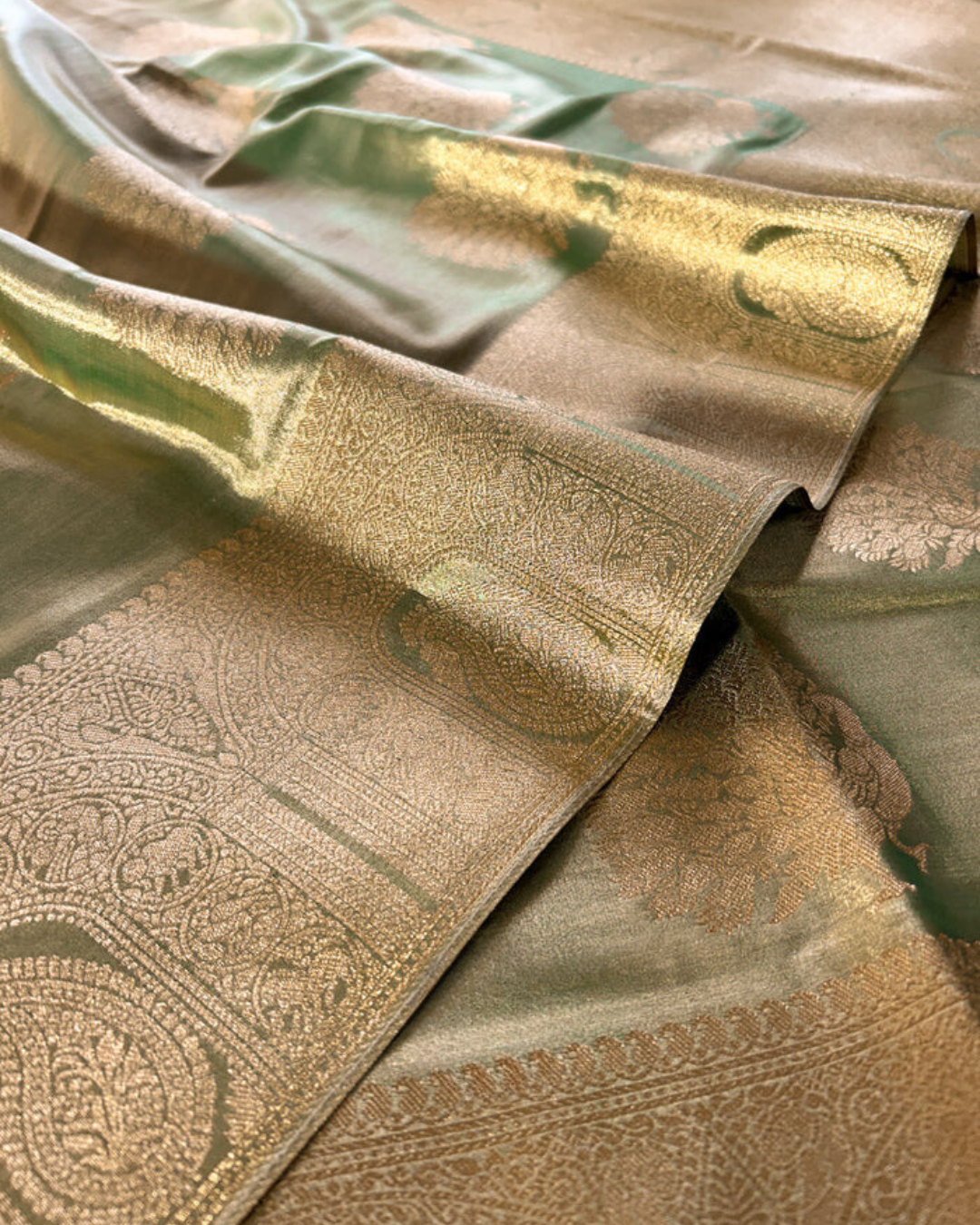 The "Opulent Bloom" Banarasi saree from Zariknyaa is a radiant creation crafted in luxurious silk. Its lush green fabric is adorned with intricately woven gold zari floral motifs, exuding timeless elegance. The grand border and pallu feature delicate artistry that celebrates the heritage of Banarasi weaving.