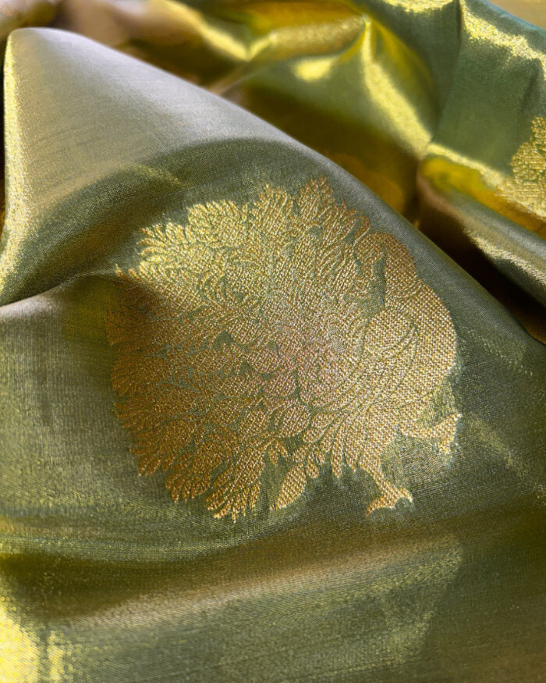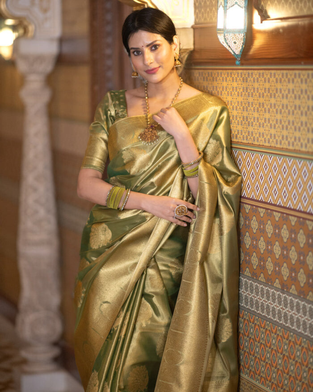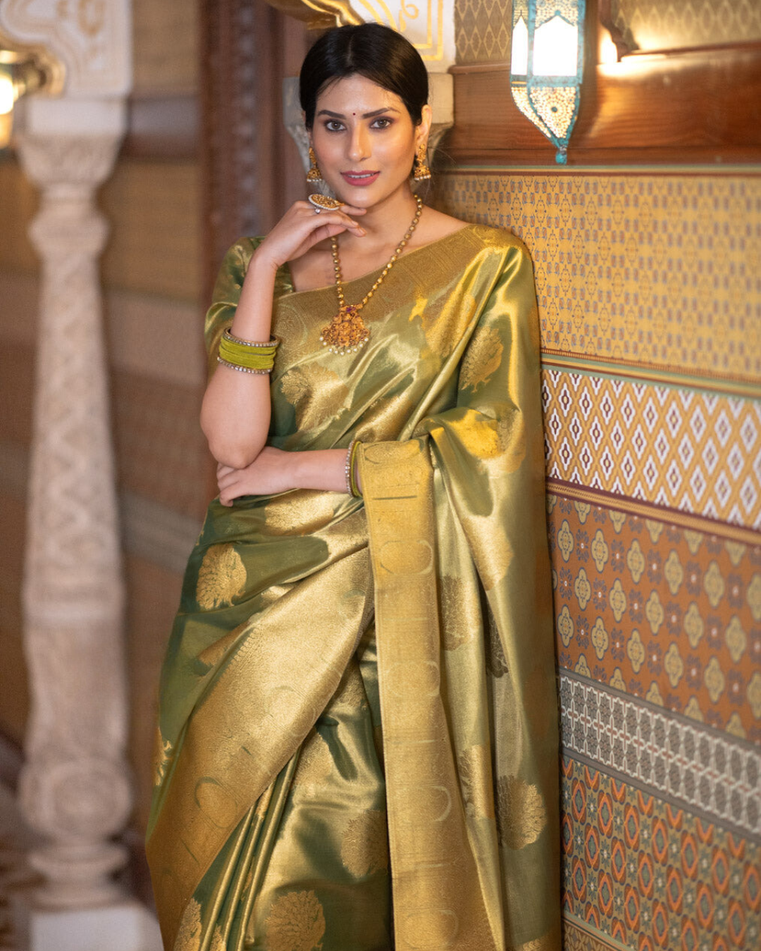 The "Opulent Bloom" Banarasi saree from Zariknyaa is a radiant creation crafted in luxurious silk. Its lush green fabric is adorned with intricately woven gold zari floral motifs, exuding timeless elegance. The grand border and pallu feature delicate artistry that celebrates the heritage of Banarasi weaving.
