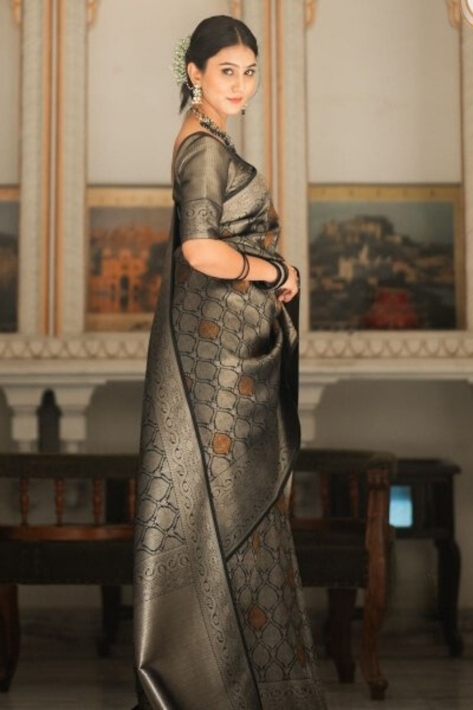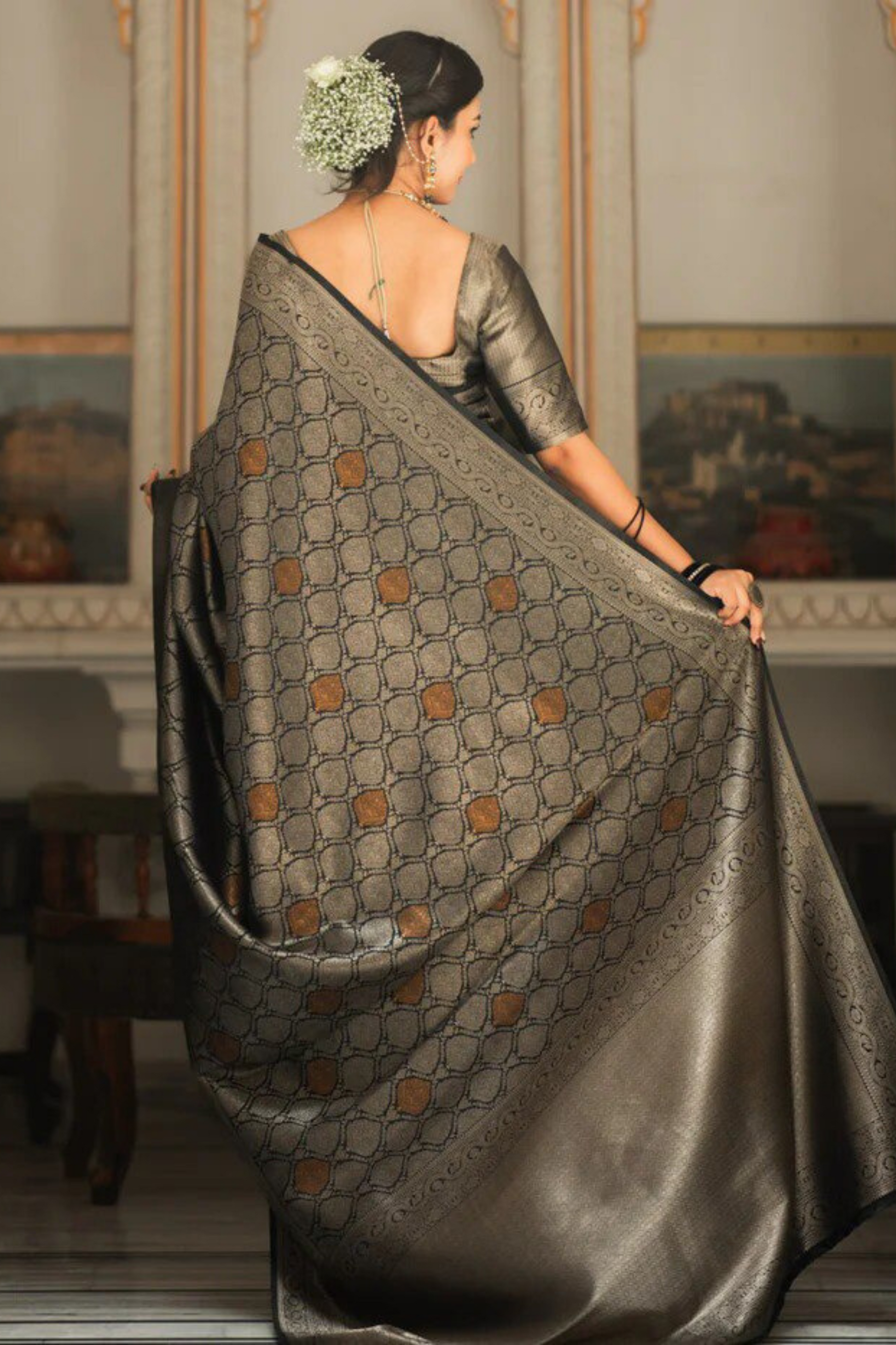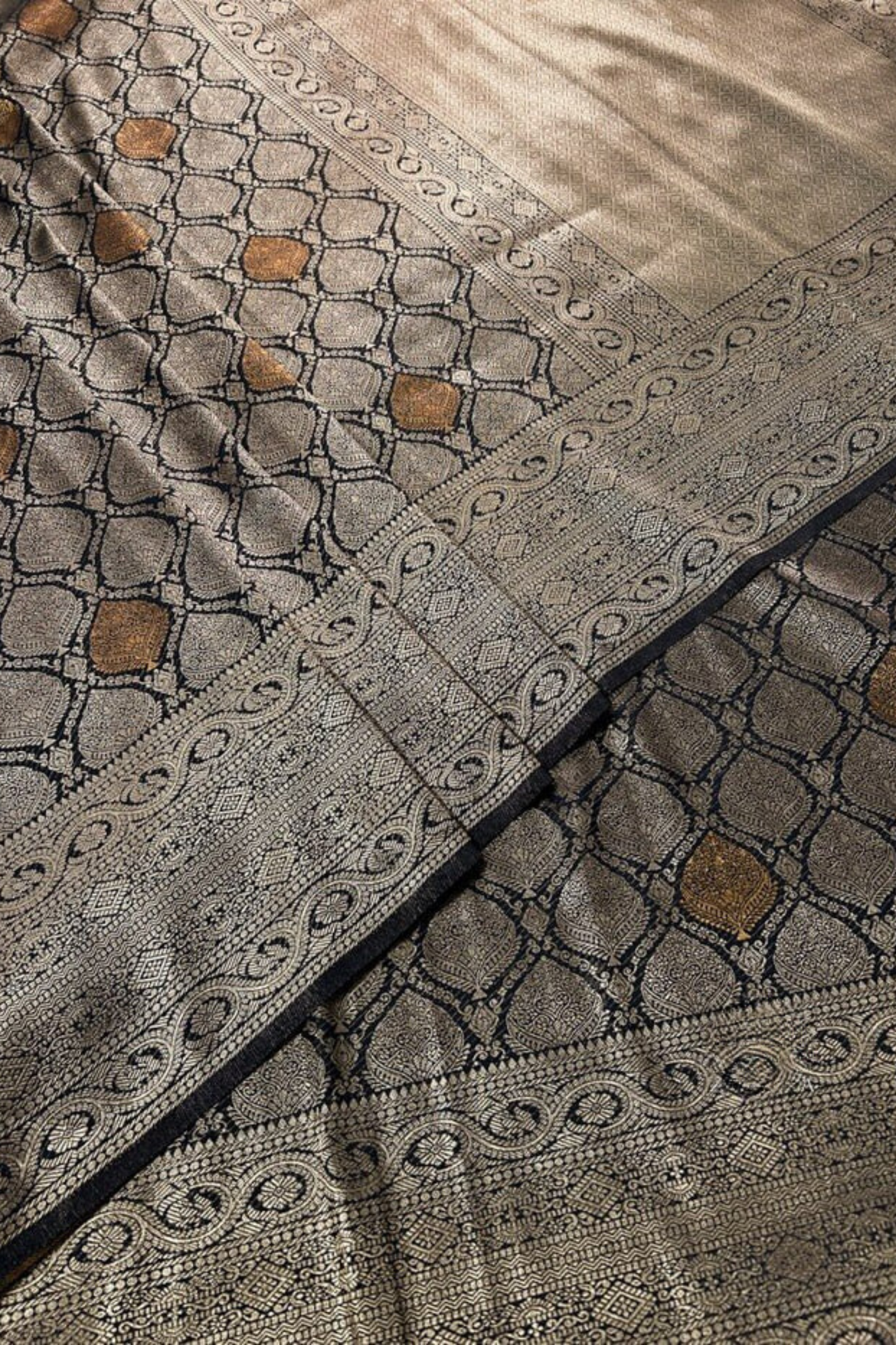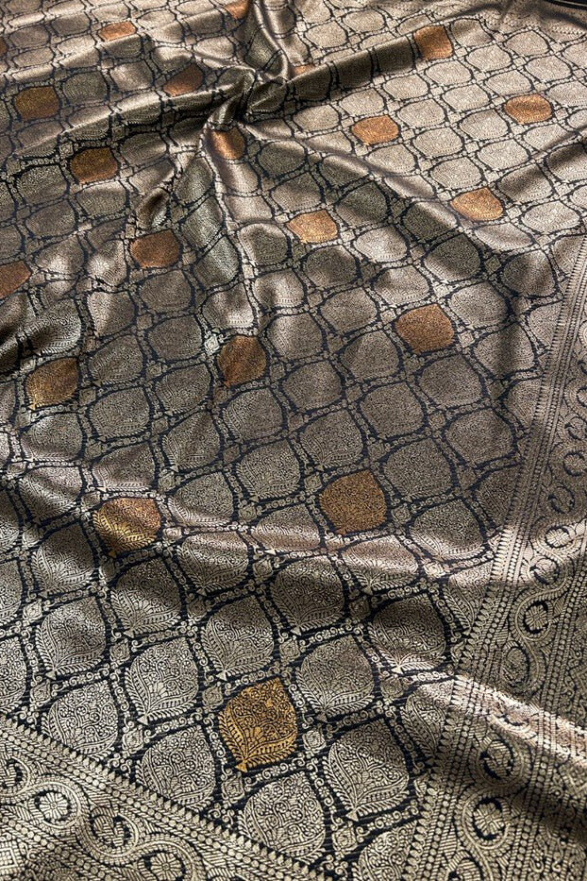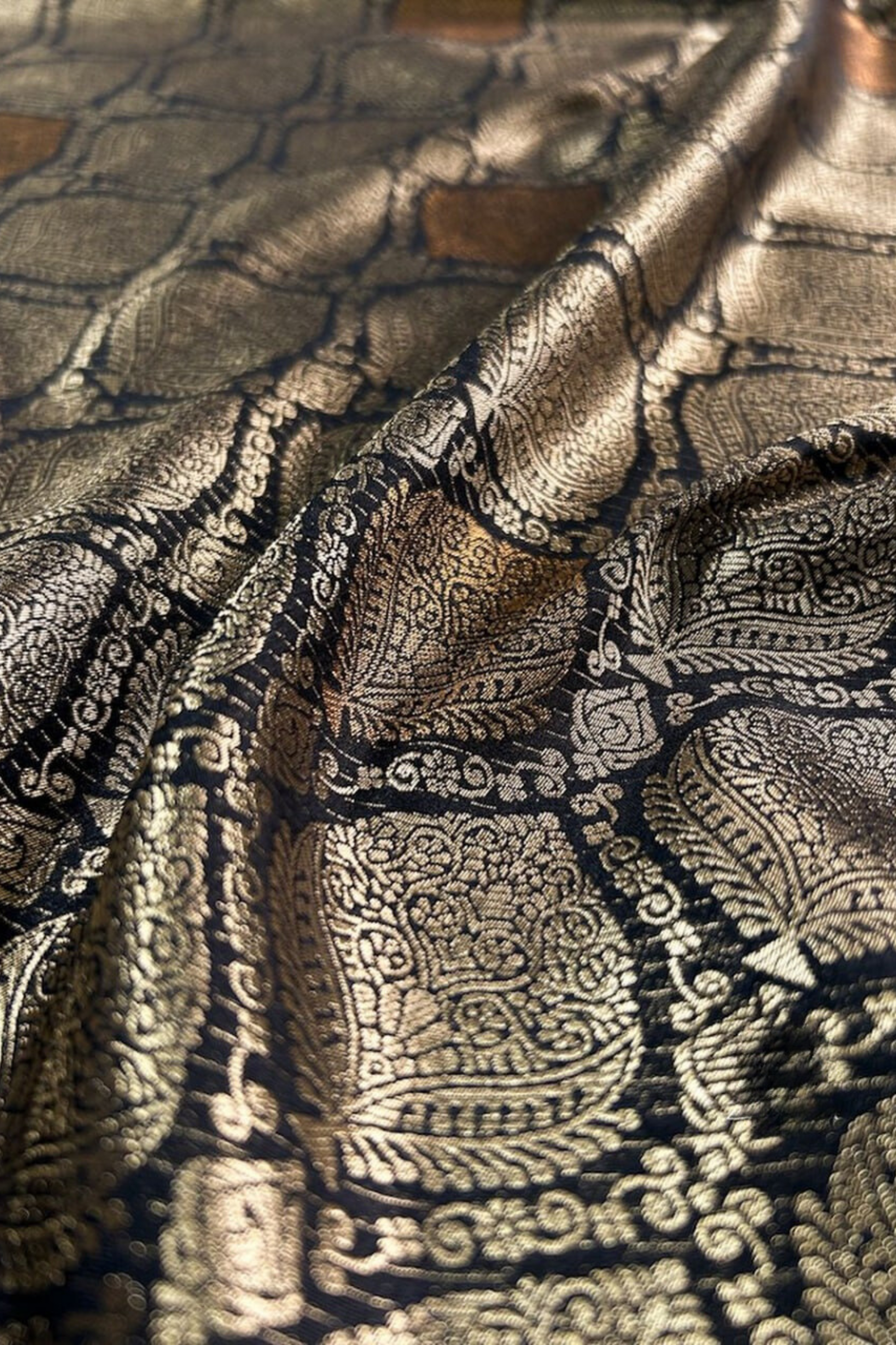 The "Opulent Ebony" saree is a luxurious Banarasi silk creation that radiates elegance and sophistication. Featuring a deep black base adorned with intricate golden and copper zari motifs, the saree showcases a striking latticework design. The rich border and pallu, detailed with traditional craftsmanship, make it a perfect choice for weddings, festive celebrations, and grand occasions.