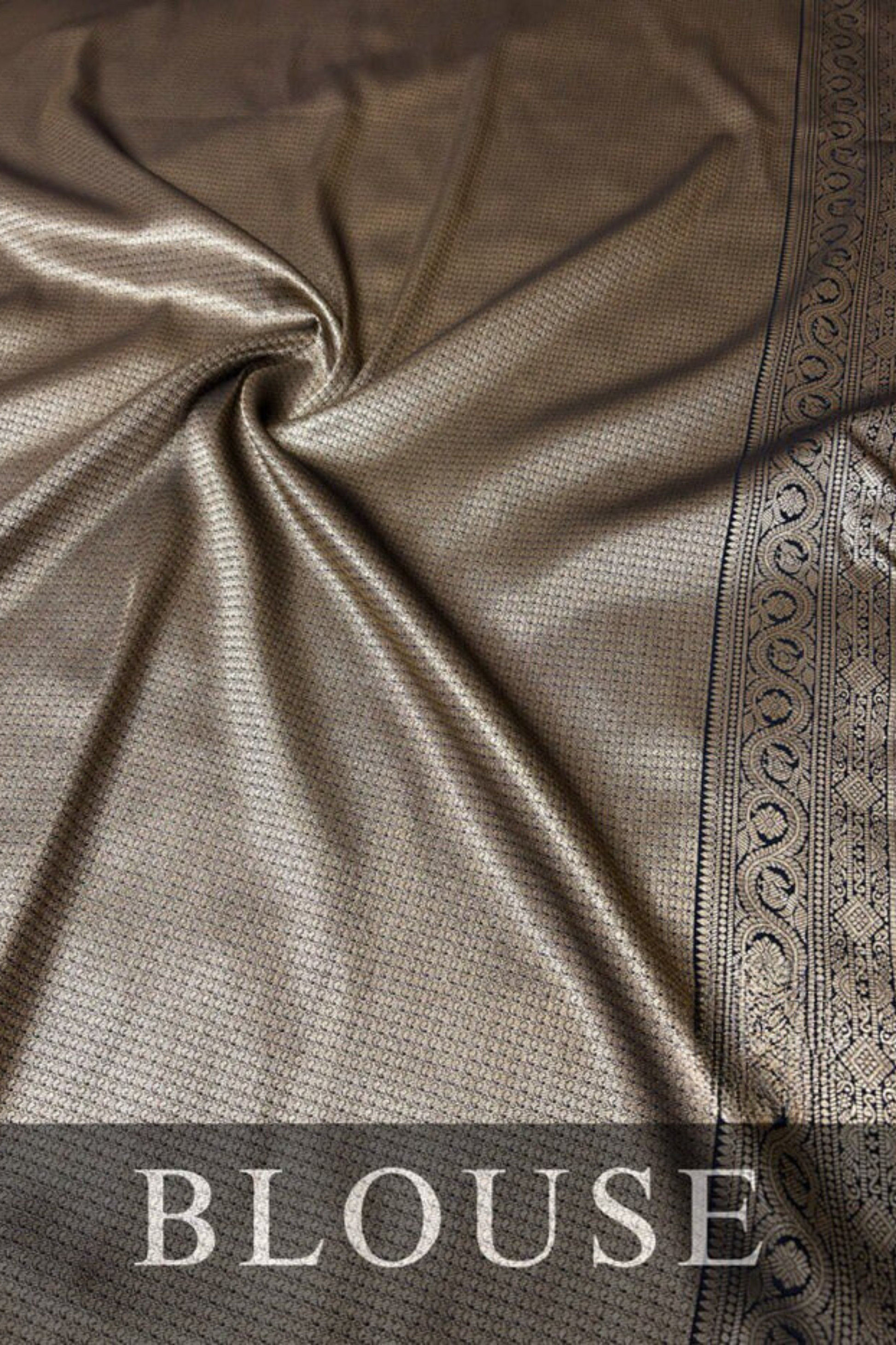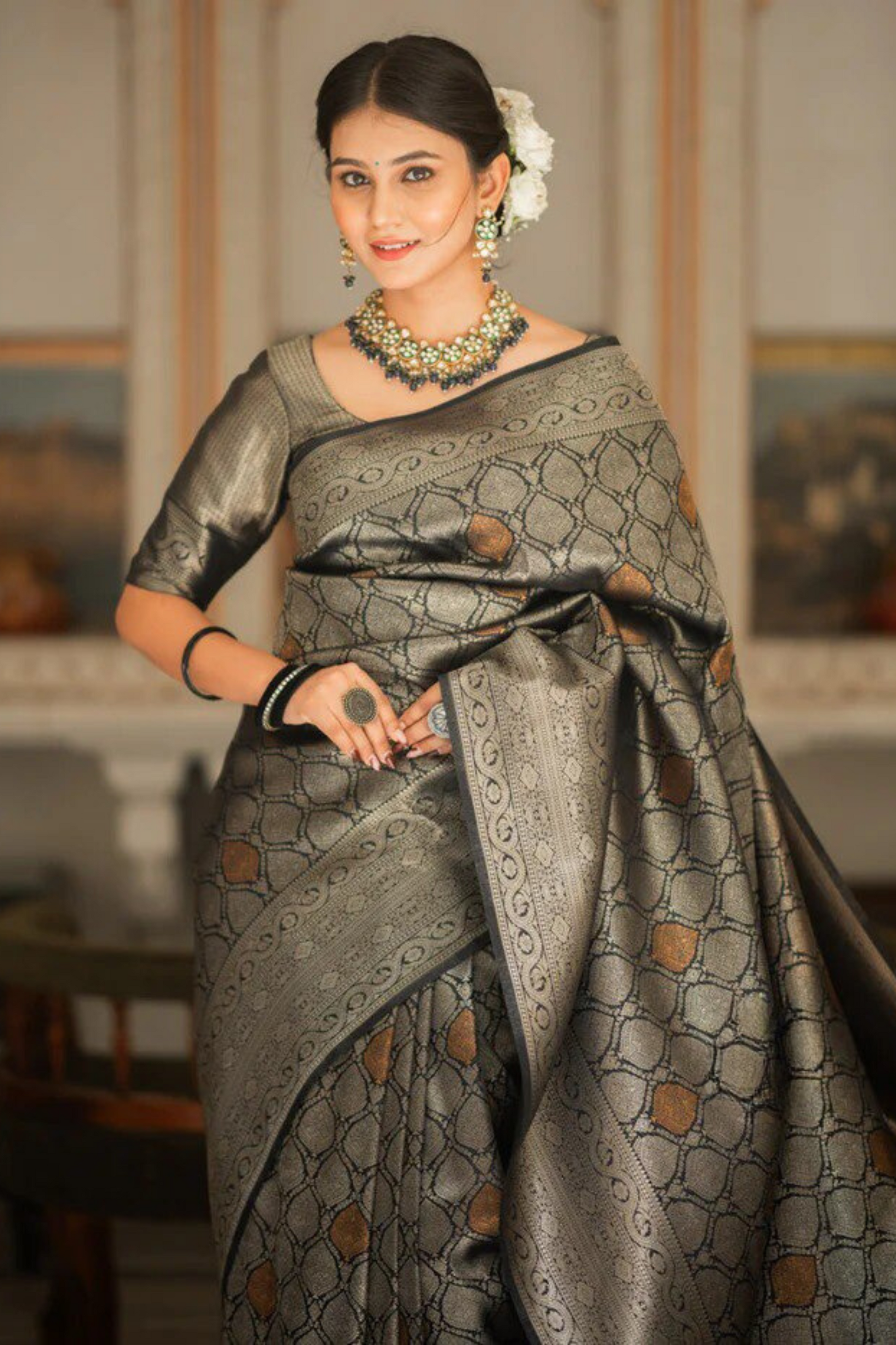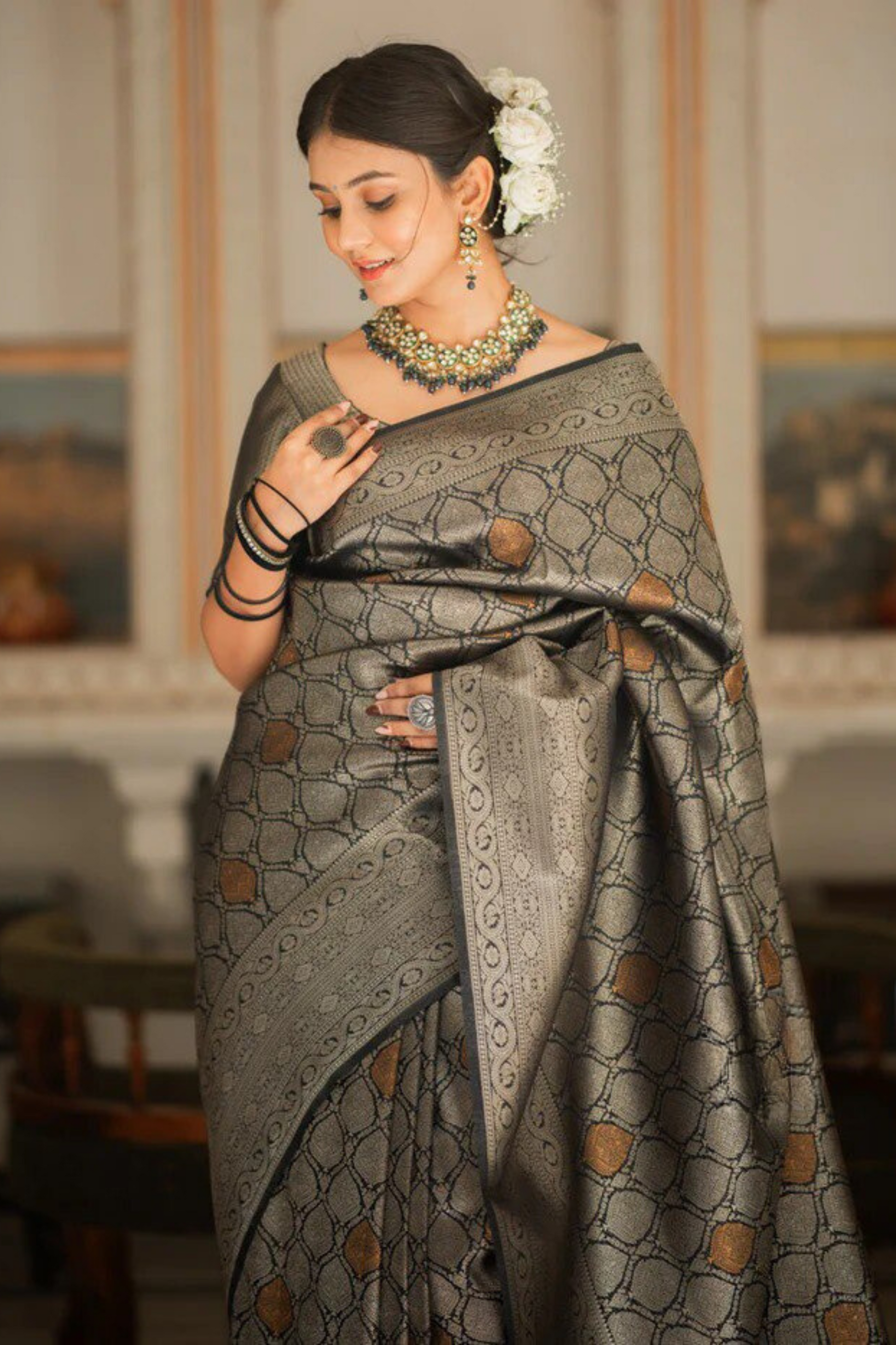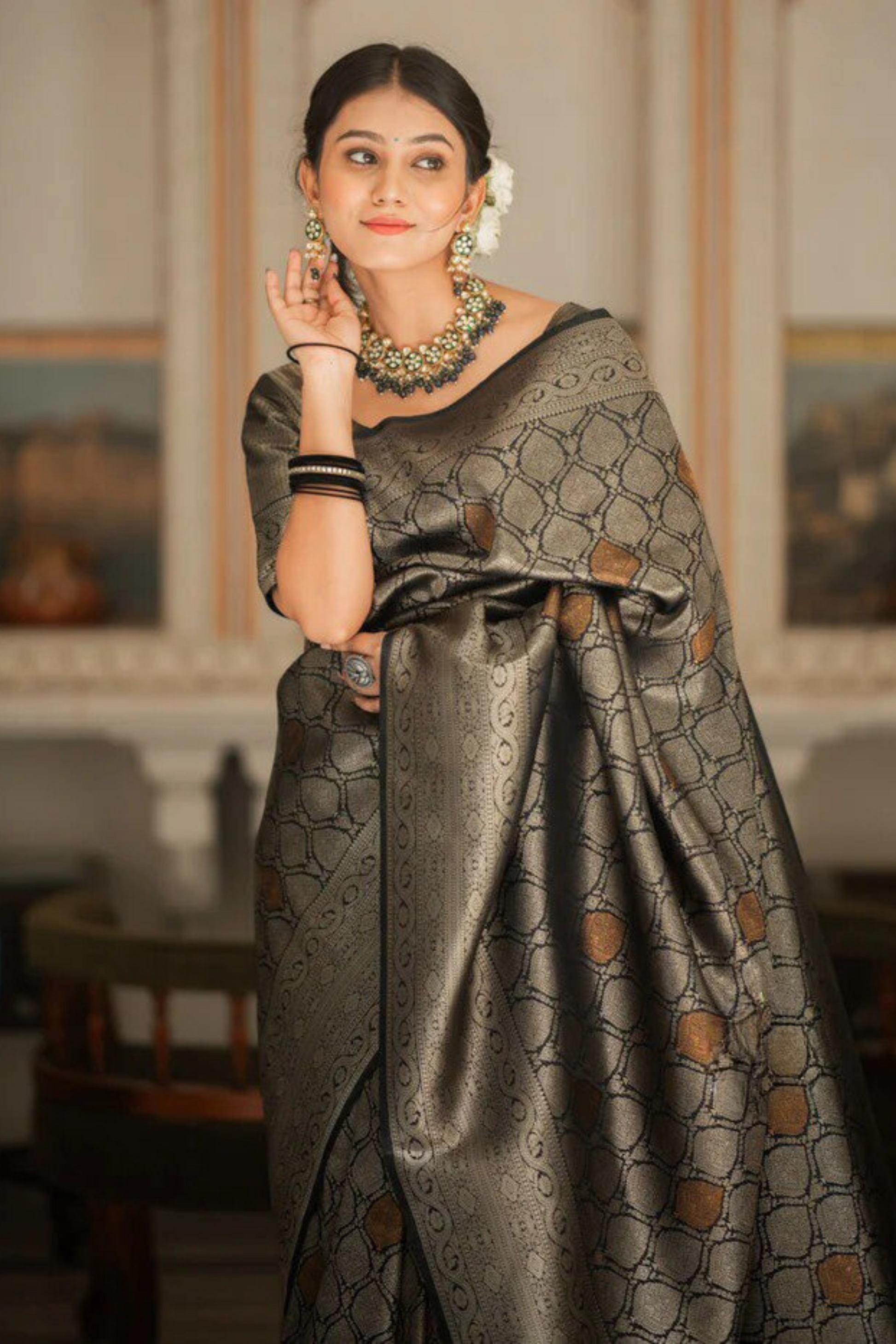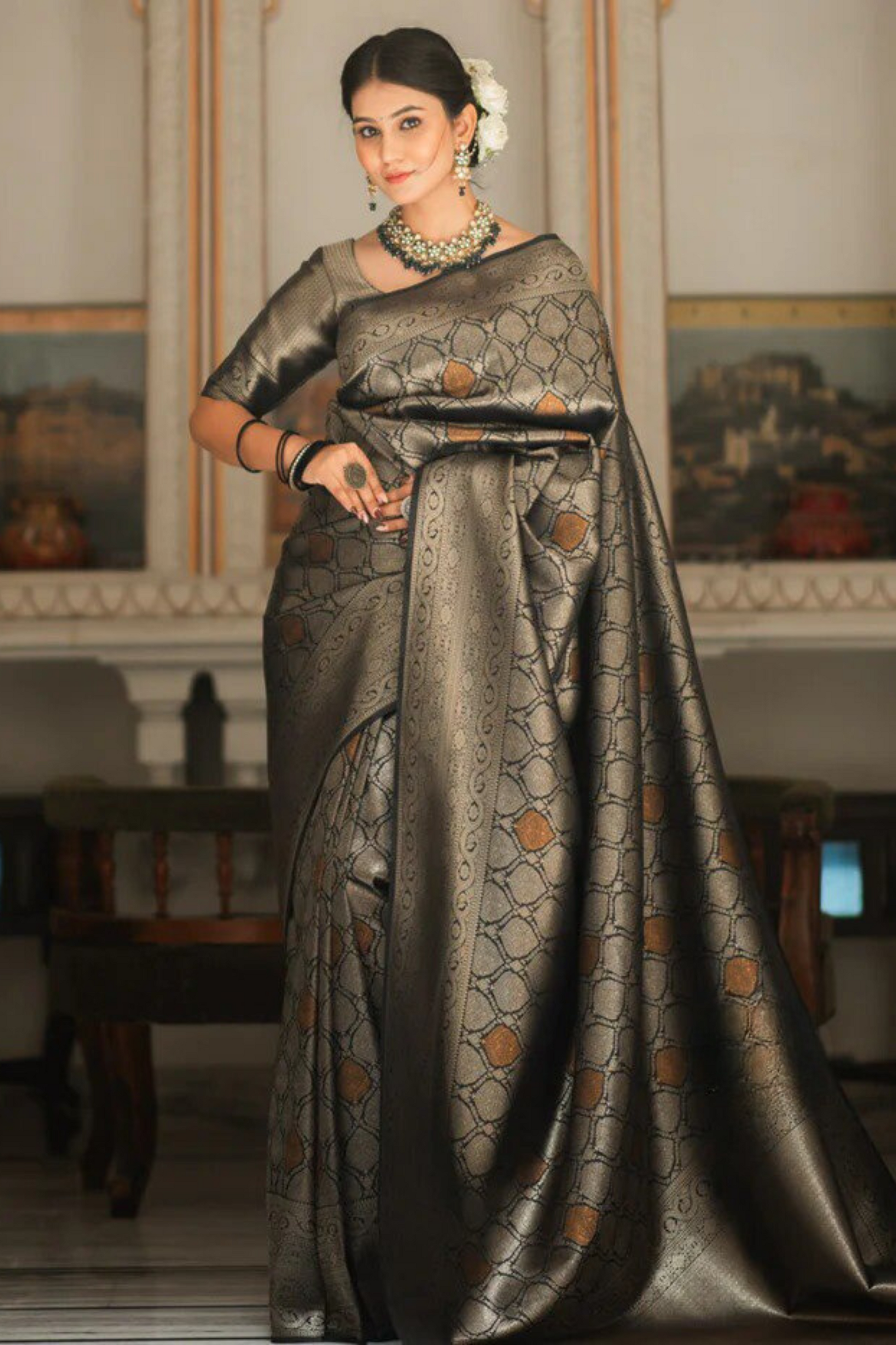 The "Opulent Ebony" saree is a luxurious Banarasi silk creation that radiates elegance and sophistication. Featuring a deep black base adorned with intricate golden and copper zari motifs, the saree showcases a striking latticework design. The rich border and pallu, detailed with traditional craftsmanship, make it a perfect choice for weddings, festive celebrations, and grand occasions.