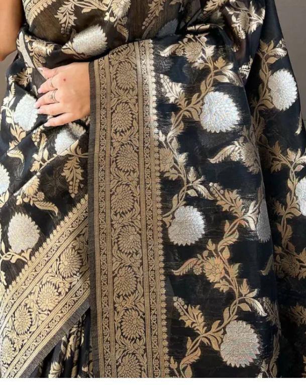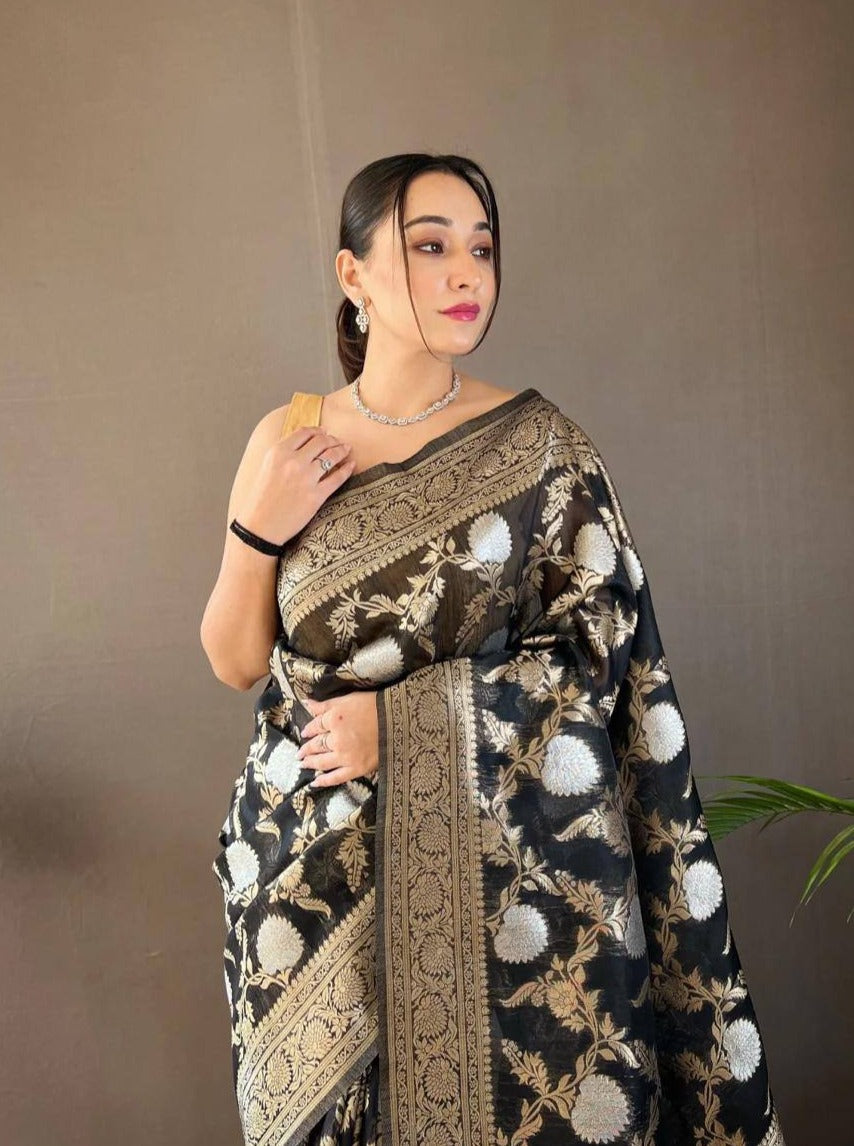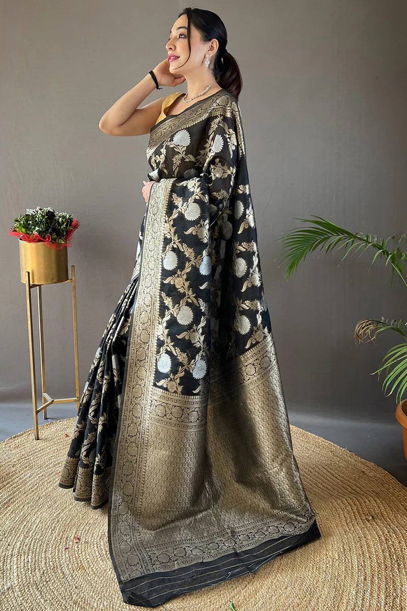 Orvi Black Soft Banarasi Silk Saree With Imaginative Blouse Piece