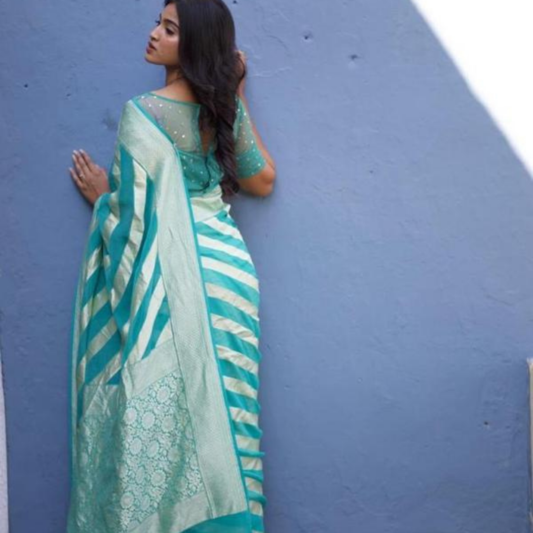 - The blouse worn by the model might be for modelling purpose only. Check the image of the blouse piece to understand how the actual blouse piece looks like.